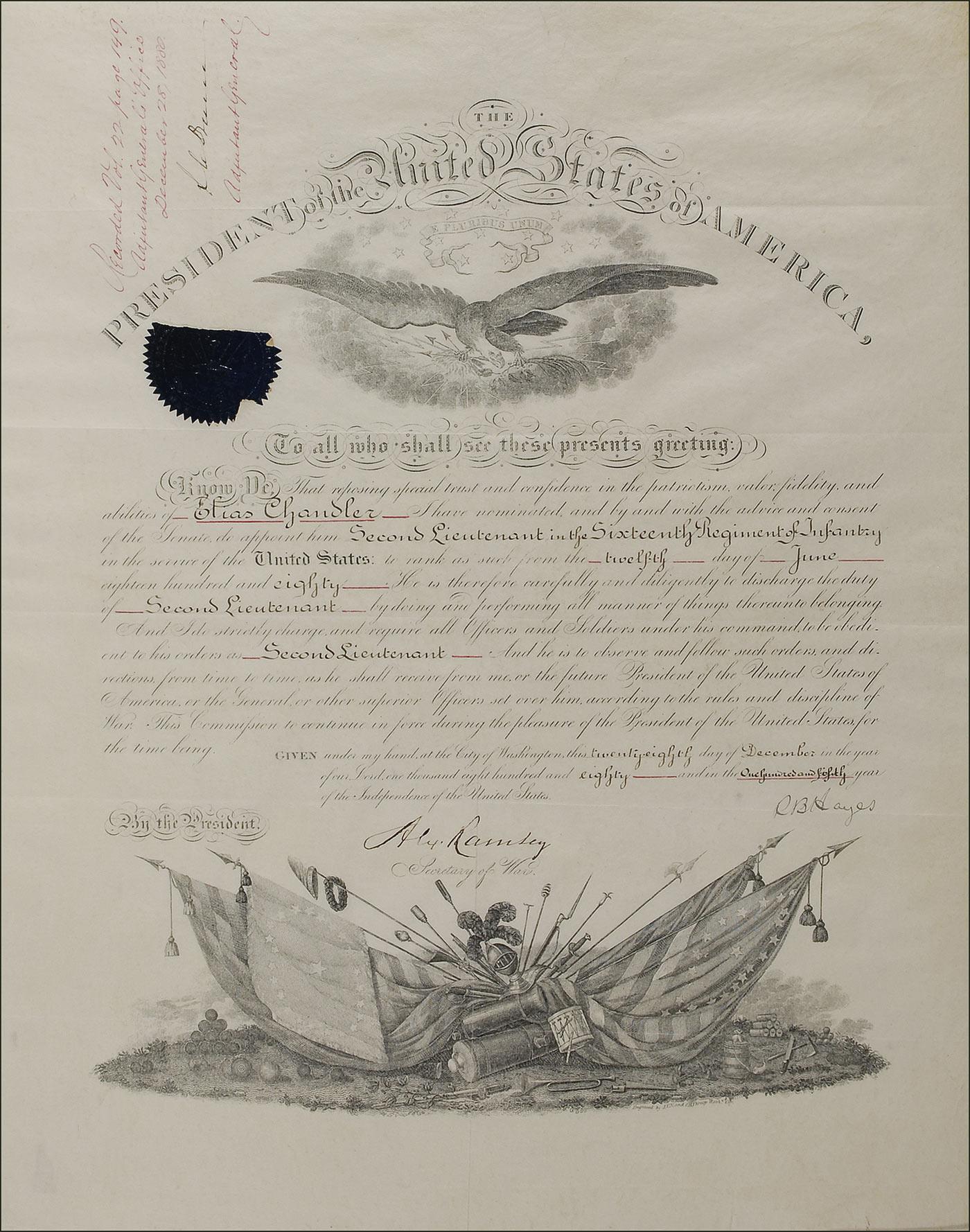 Partly-printed DS as president, signed “R. B. Hayes,” one page, 15.5 x 19.5, December 28, 1880. President Hayes appoints Elias Chandler a “Second Lieutenant in the Sixteenth Regiment of Infantry.” Signed at the conclusion by Hayes, and countersigned by Secretary of War Alexander Ramsey. In fine, bright condition, with intersecting folds, with one horizontal fold through a few letters of signature, and a bit of light toning. The partial black seal is lightly worn. Pre-certified John Reznikoff/PSA/DNA and RRAuction COA.
