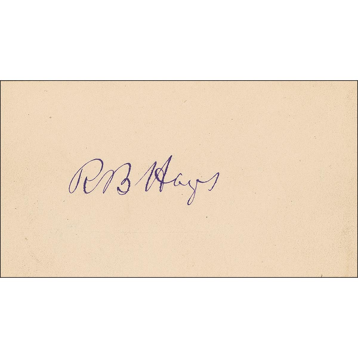 Vintage fountain pen signature, “R. B. Hayes,” on an off-white 3.5 x 2 card. In fine condition.