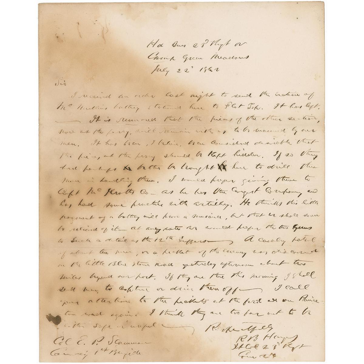 Early war-dated ALS signed “R. B. Hayes, Lt. Col 23rd Regt Comdg,” one page, 7.75 x 9.75, July 22, 1862. Letter to his commanding officer Eliakim Scammon, asking for artillery and reporting on enemy activity. In part: “I received an order last night to send the section of McMullin’s battery stationed here at Flat Top. It has left. It is rumored that the pieces of the other section now at the ferry, will remain with us to be moved by our men. It has been, I believe, now considered desirable that the piece at the ferry should be kept. If so the had perhaps better be brought here to drill these men in handling them. I would prefer giving them to Capt. McMroth’s Co as…he had some practice with artillery. He thinks this little fragment of a battery will prove a nuisance, but that he shall soon be relieved of it…A cavalry patrol of about ten men, or a picket of the enemy was discovered on the little Blue Stone road yesterday afternoon about two miles beyond our post. If they are there this morning I shall send men to capture or drive them off. I call your attention to the pickets at the first…on Princeton road again. I think they are too far out to be safe or useful.” Intersecting folds, and moderate areas of toning/staining to left side of letter, lightly affecting some portions of text, otherwise very good condition.