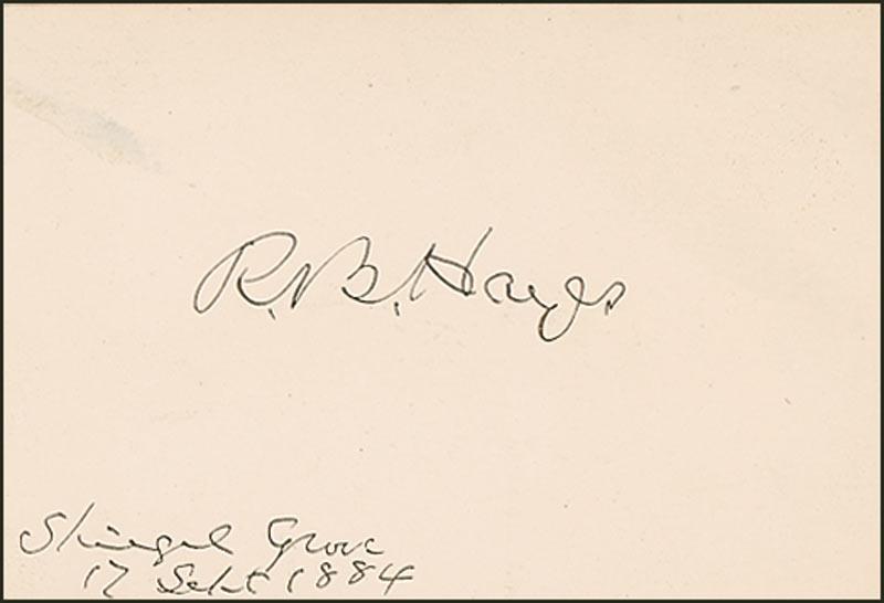 Crisp ink signature, “R. B. Hayes, Spiegel Grove, 12 Sept. 1884,” on an off-white 3.75 x 2.5 card. In fine condition, with small spot of soiling to top left affecting nothing, and a small mounting remnant to reverse.
