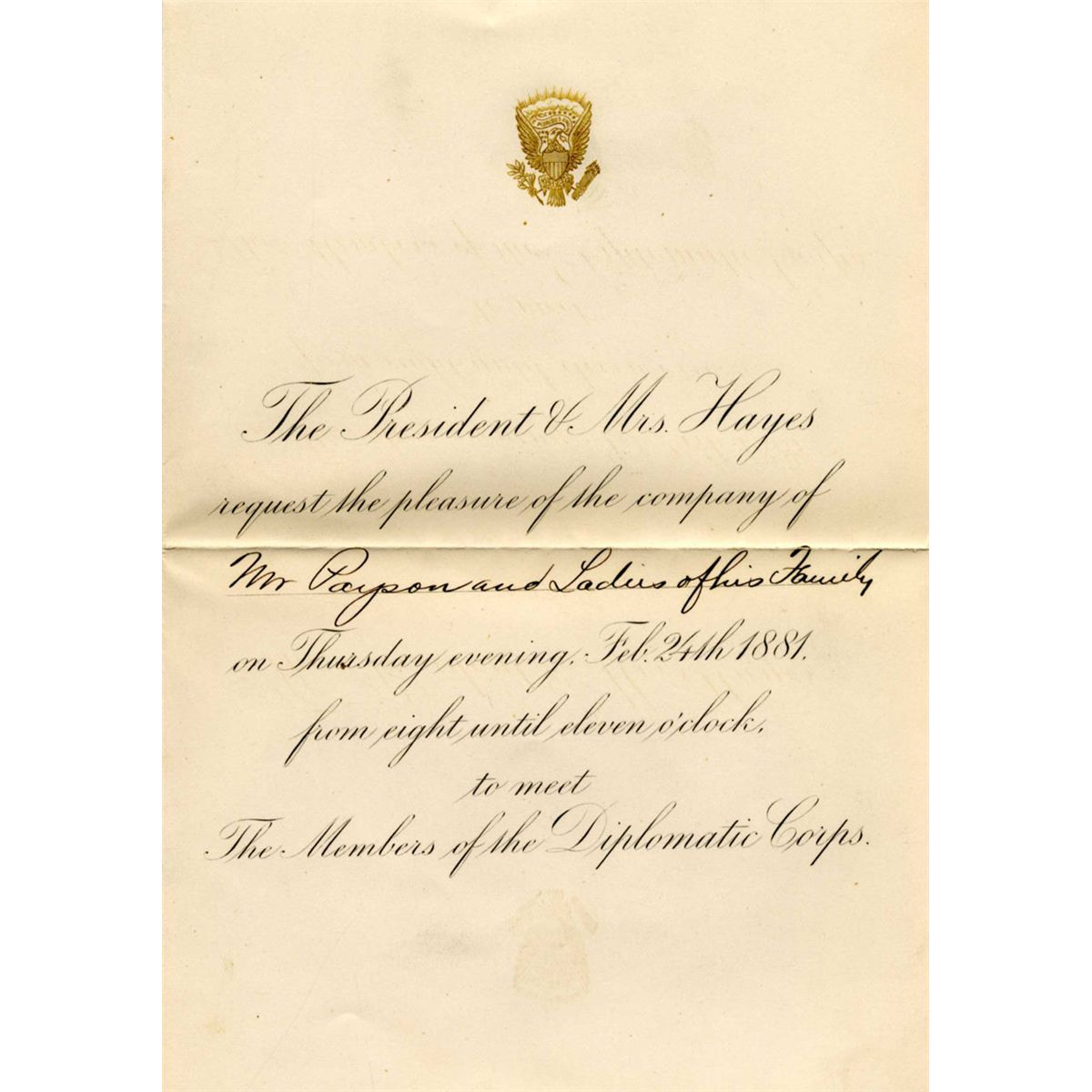 Invitation from President and Mrs. Rutherford B. Hayes dated 24 February 1881 on Executive Mansion stationery to Lewis E. Payson, Representative from Illinois. Hayes would leave the White House the following month after only one term as a result of agreeing to the Compromise of 1877 which settled that year's contentious election in his favor. 5.5'' x 7.75'' invitation, folded to fit into two accompanying envelopes, has some separation along folds. Overall toning and light soiling, else very good.
