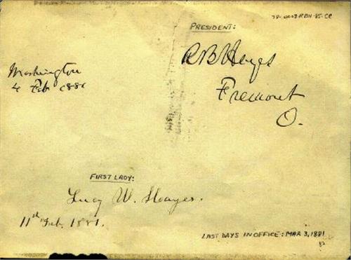 Rutherford and Lucy Hayes. Both signing on 4 -1/2 x 6 sheet, to which Lucy has added the date "11th Feb. 1881" below her signature, about three weeks before Hayes' term as President ended. At top of page, signature "R.B. Hayes, Fremont, O." occupying three lines. At far left, the President has added "Washington, 4 Feb. 1881." A 1" vertical tear at top, but not touching any text. The President has signed in dark ink, the First Lady's a bit light. Minor tape stain on verso. Pleasing memento of the Hayes' last days in the White House.