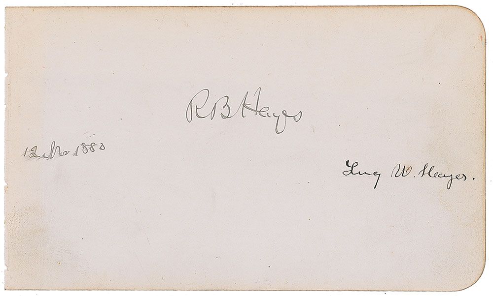Ink signature, as president, “RB Hayes, 12 Nov 1880,” and “Lucy W. Hayes,” on an off-white 6.75 x 4 album page. Some scattered light toning and soiling to edges, otherwise fine condition.