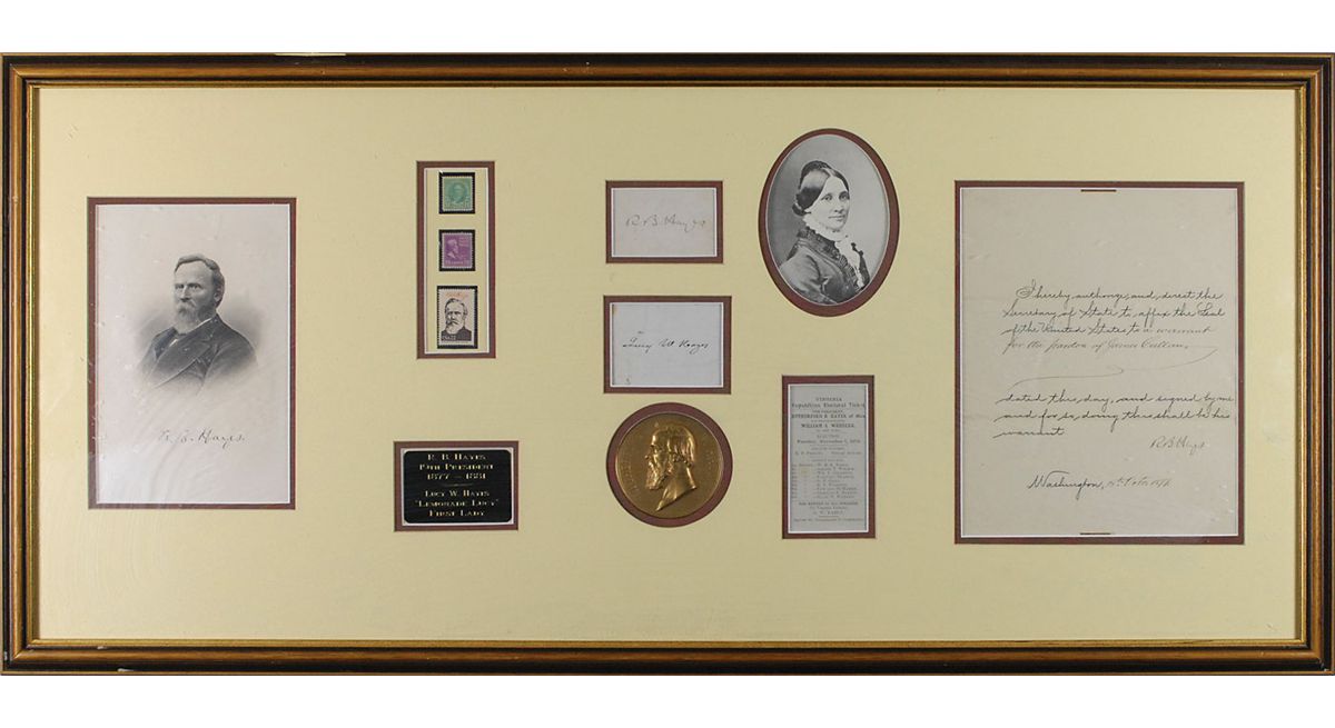 DS, as president, signed “R. B. Hayes,” one page, 8 x 10, October 18, 1877. Hayes orders the Secretary of State “to affix the Seal of the United States to a warrant for the pardon of James Callan”; and ink signatures, “R. B. Hayes,” and “Lucy W. Hayes,” on individual off-white slips. All are double-matted and framed with two portraits, a small plaque, electoral ticket, and a medallion of Hayes, to an overall size of 37.75 x 18. In fine condition, with some light creasing to Lucy’s slip. Oversized.