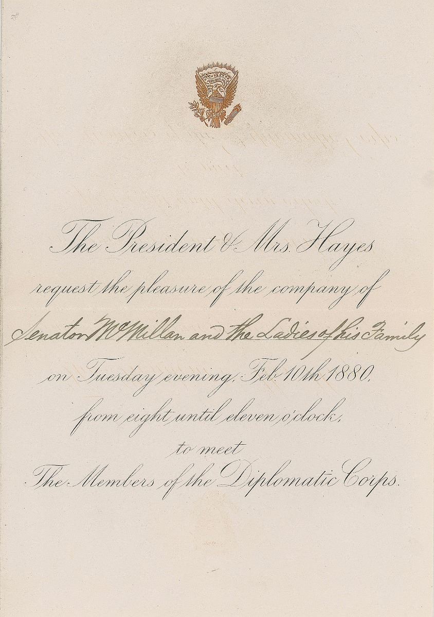 Partly-printed invitation filled out in another hand, unsigned, one page, 5.75 x 7.75, February 10, 1880. In part: “The President & Mrs. Hayes request the pleasure of the company of Senator McMillan and the Ladies of his Family…to meet The Members of the Diplomatic Corps.” In fine condition, with mild soiling.
