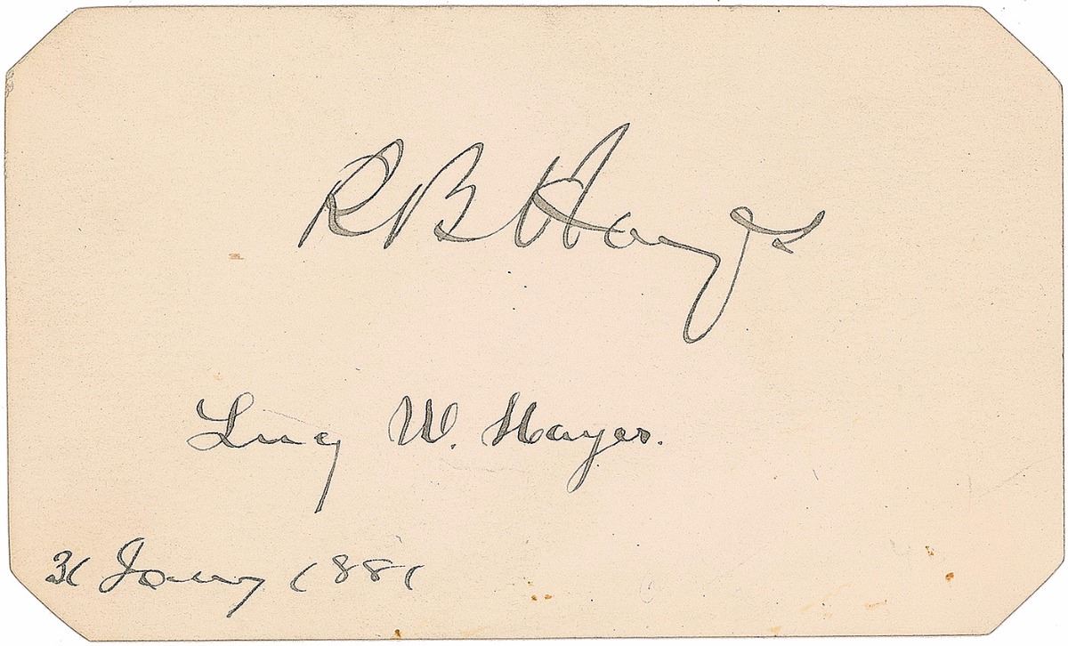 Ink signatures as president and first lady, "R. B. Hayes" and "Lucy W. Hayes," on an off-white 4 x 2.5 card. The president has added the date in the lower left corner, "31 Jany 1881." In fine condition, with clipped corner tips.