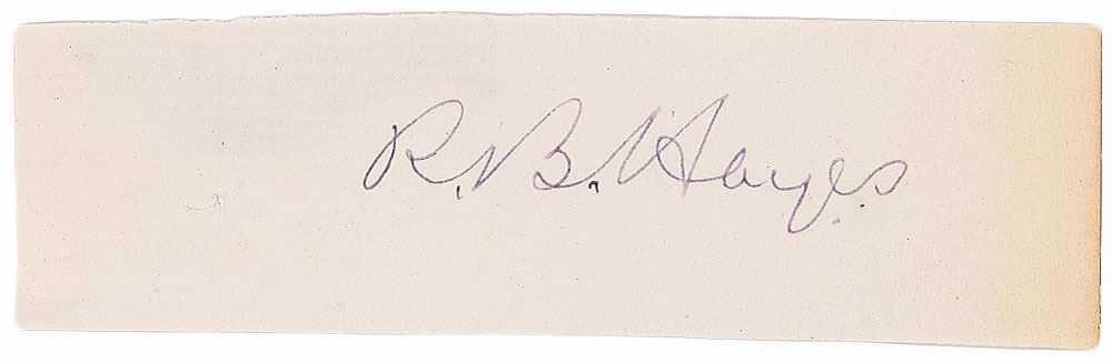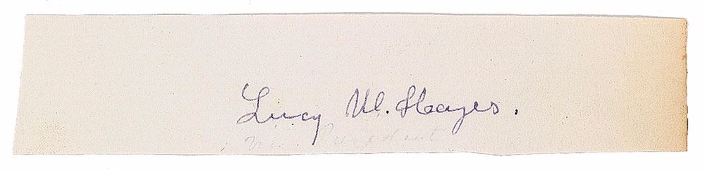 Purple ink signatures of the president and first lady, "R. B. Hayes" and "Lucy W. Hayes," on individual off-white slips clipped from the pages of an autograph album. In fine condition.