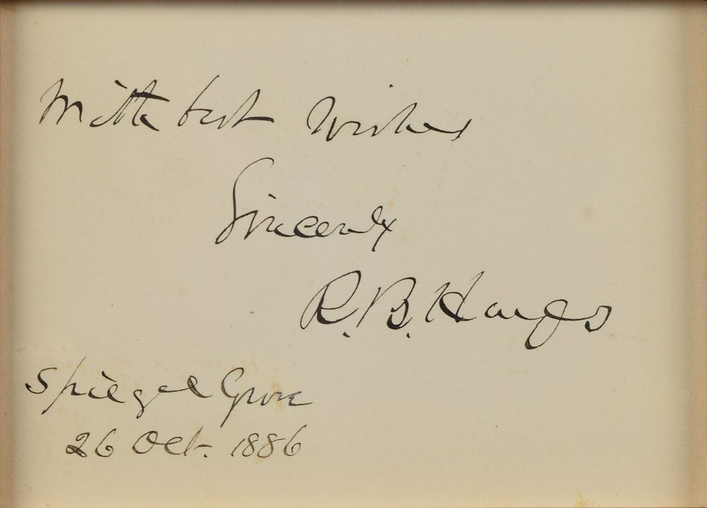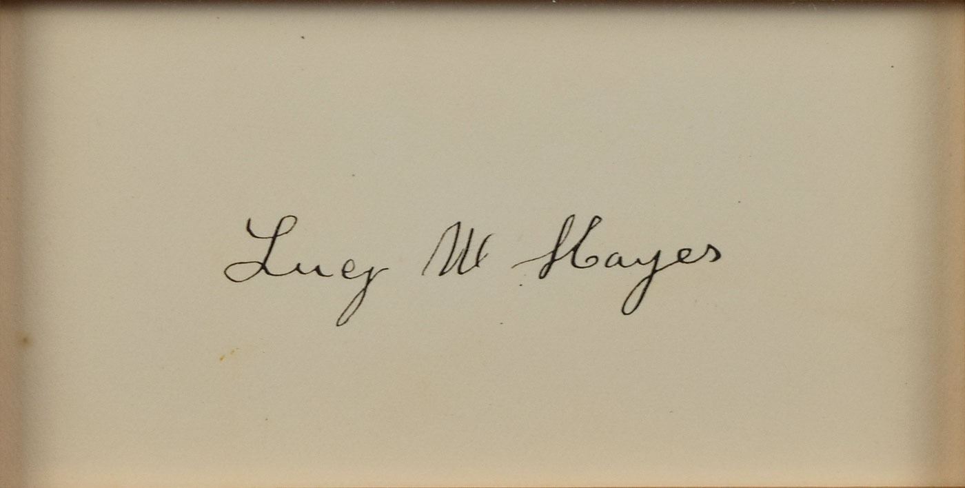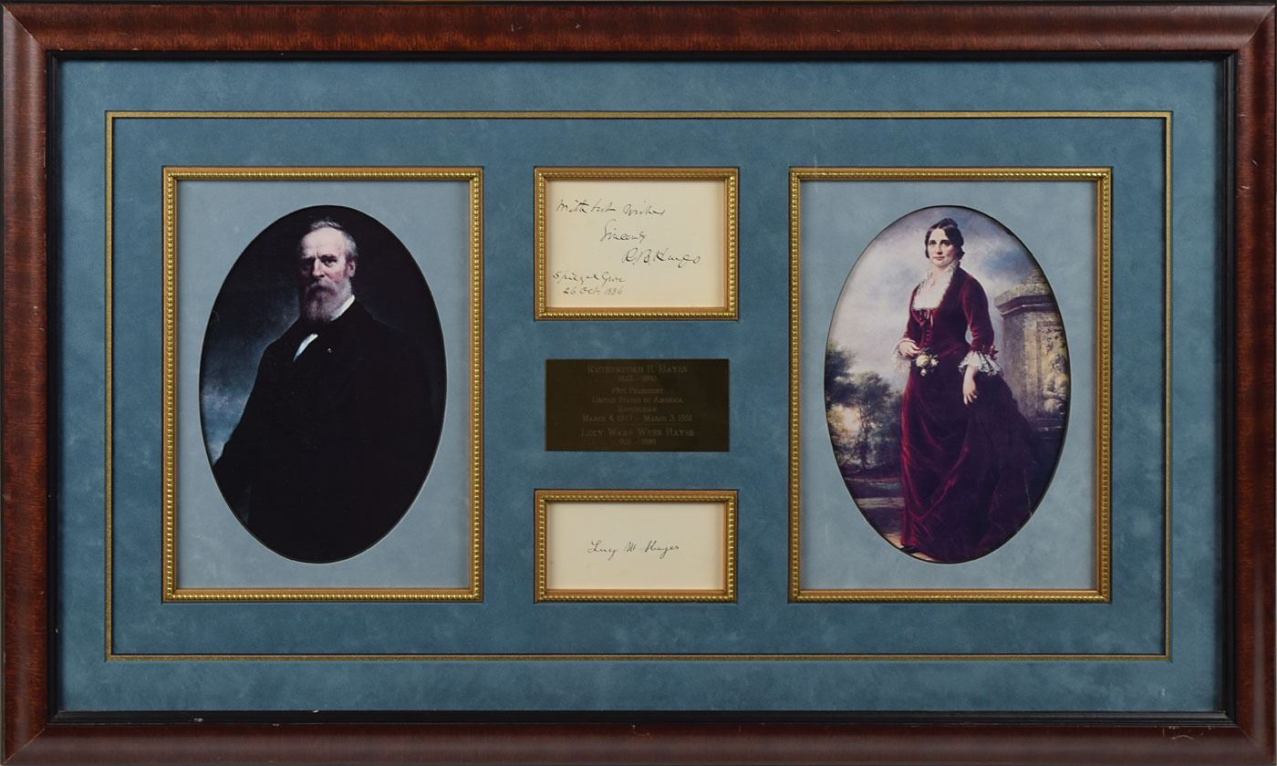 Signatures of Rutherford and Lucy Hayes: an ink signature, "With best wishes, Sincerely, R. B. Hayes, Spiegel Grove, 26 Oct. 1886," on an off-white 3.75 x 2.75 card; and an ink signature, "Lucy W. Hayes," on an off-white 3.75 x 1.75 card. Both are impressively double-suede-matted and framed with portraits and an engraved plaque to an overall size of 27.75 x 16.75. In overall fine to very fine condition.