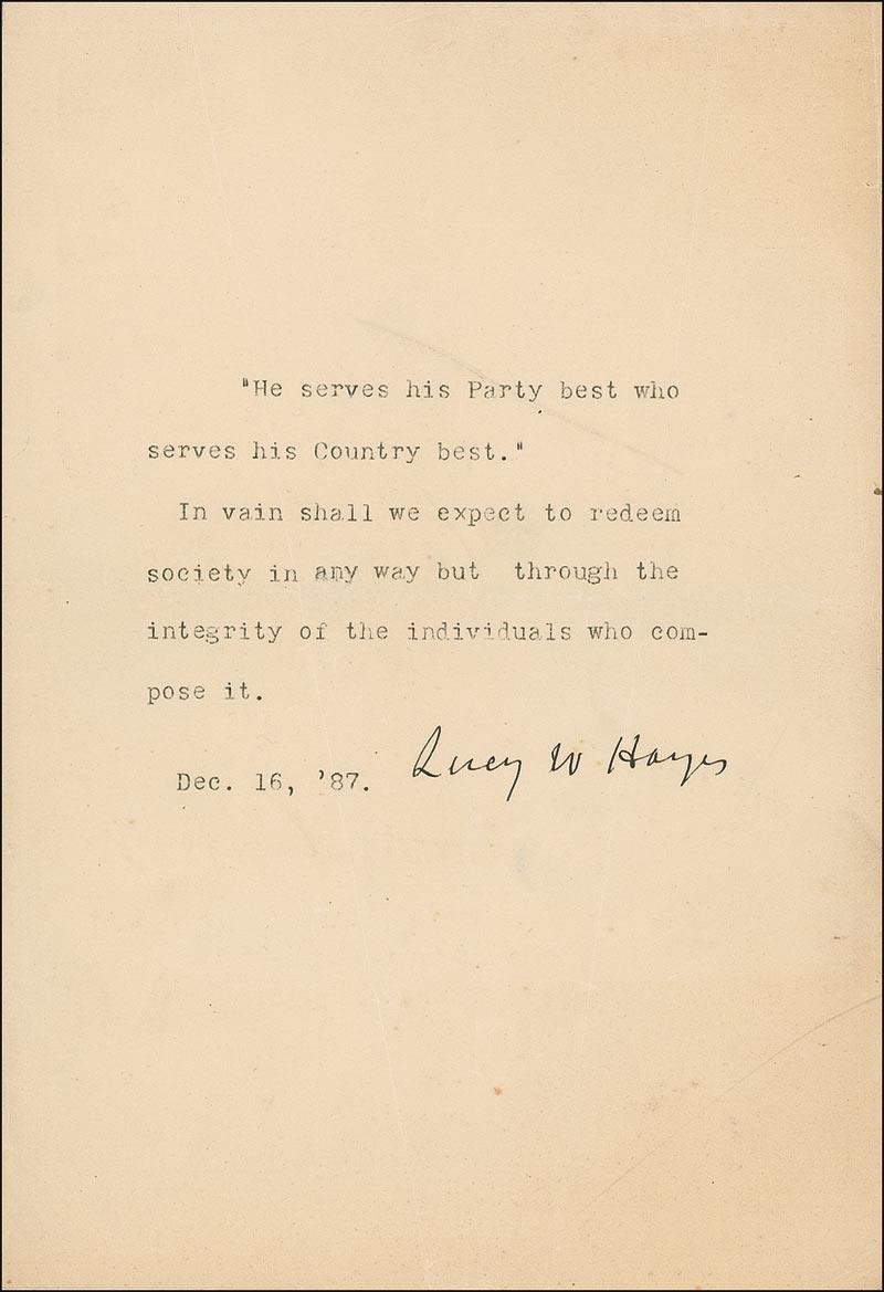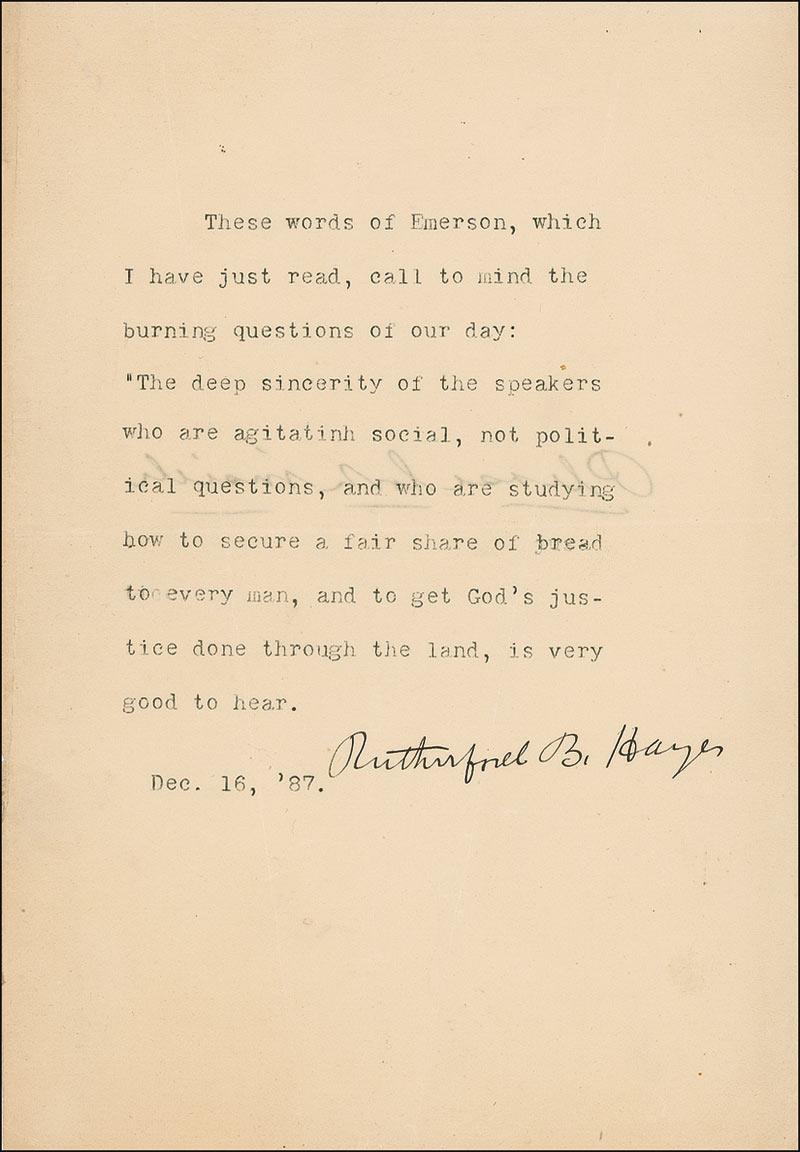 TQS on an off-white 6 x 8.5 sheet, dated December 16, 1887, signed at the bottom, “Rutherford B. Hayes.” The quote reads, in full: "These words of Emerson, which I have just read, call to mind the burning questions of our day: 'The deep sincerity of the speakers who are agitatinh [sic] social, not political questions, and who are studying how to secure a fair share of bread to every man, and to get God's justice done through the land, is very good to hear." On the reverse, Hayes has written, “Please look inside.” Accompanied by a similar typed quotation, signed by his wife, "Lucy W. Hayes." In fine condition, with mild overall toning, scattered creases, and tape remnants to top of both sheets on reverse. Pre-certified John Reznikoff/PSA/DNA and RRAuction COA.