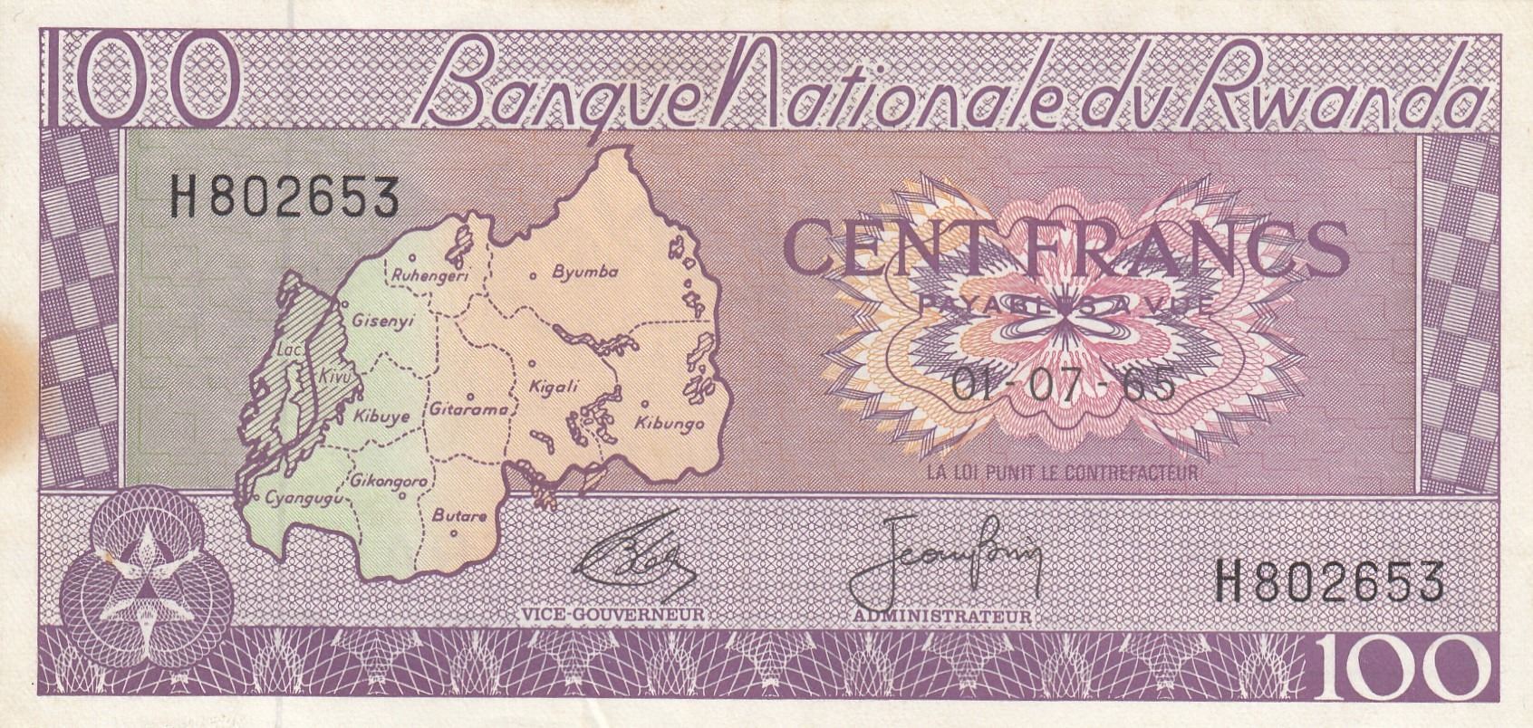Rwanda, 100 Francs, 1965, XF, p8bbr/serial number: H802653