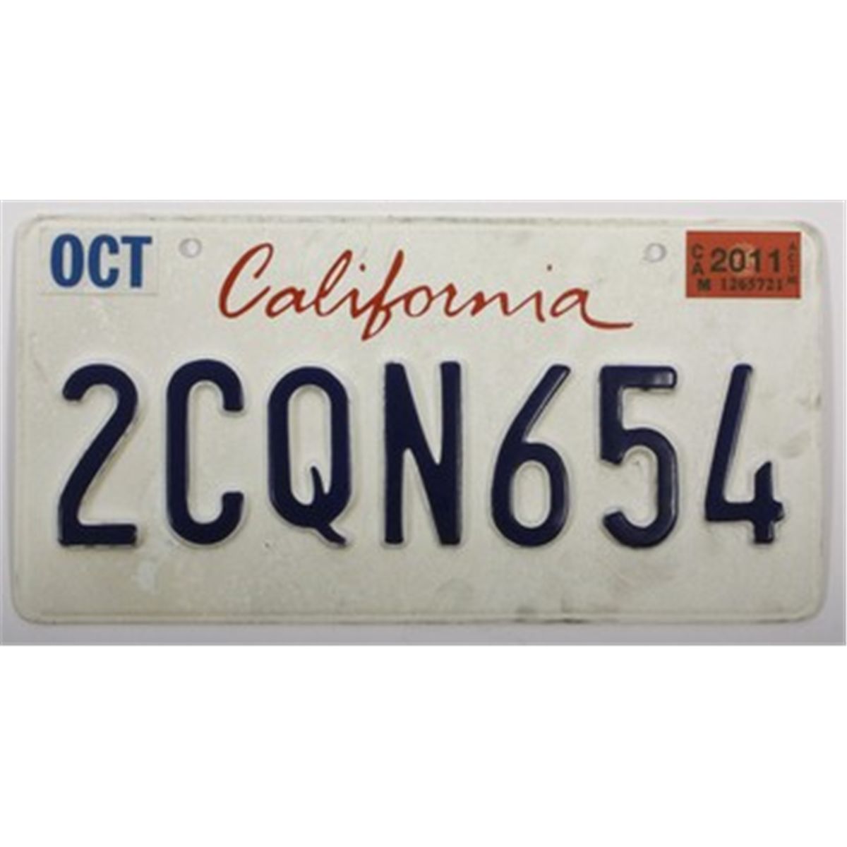 This license plate was used by the character "Driver," portrayed by actor Ryan Gosling, in the 2011 motion picture, "Drive." The white California license plate with "2CQN654" has faux October, 2011 registration tags and the back of the plate has "Driver's Impala" handwritten in black ink.