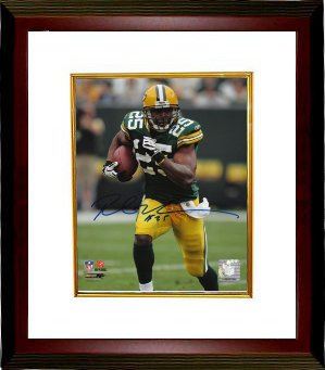 Ryan Grant had a successful first season with the Packers, rushing for almost 1,000 yards, including five 100+ yard games, in 10 starts. He set franchise records with 201 rushing yards and 3 touchdowns in the Packers' divisional playoff game win against the Seattle Seahawks, a performance for which he was heavily praised, as they went on to reach the NFC Championship Game. Ryan Grant has hand autographed this Green Bay Packers 8x10 Photo. Custom White Mat and Premium Mahogany Framed as shown. LOJO Hologram and Certificate of Authenticity from Athlon Sports.