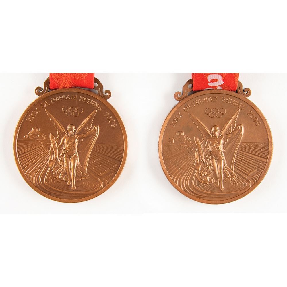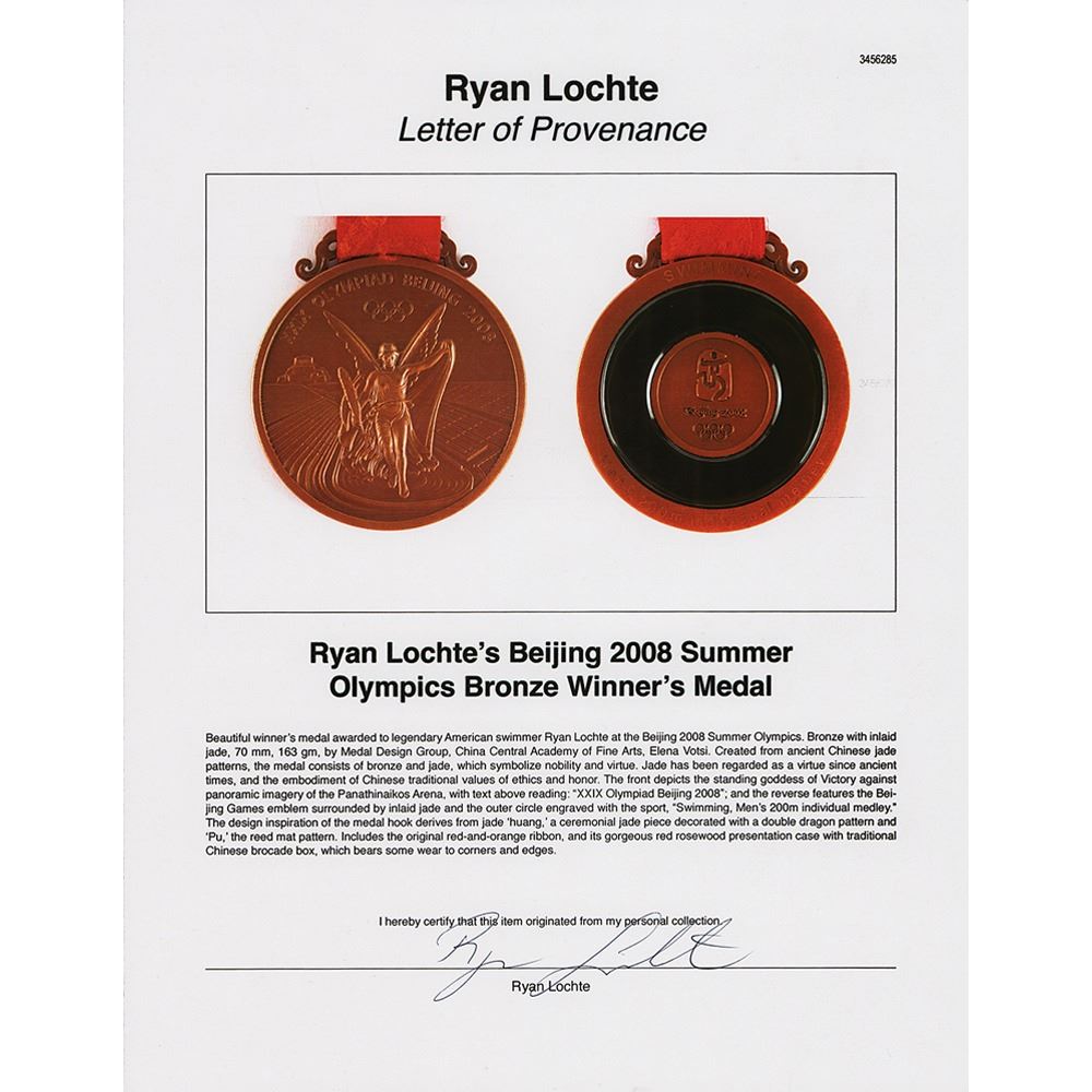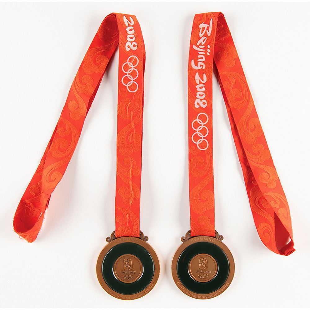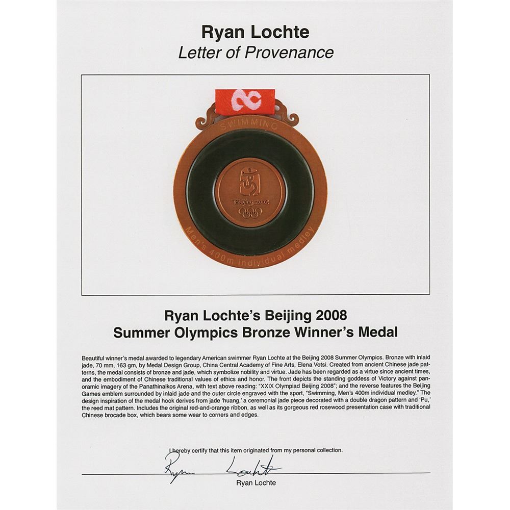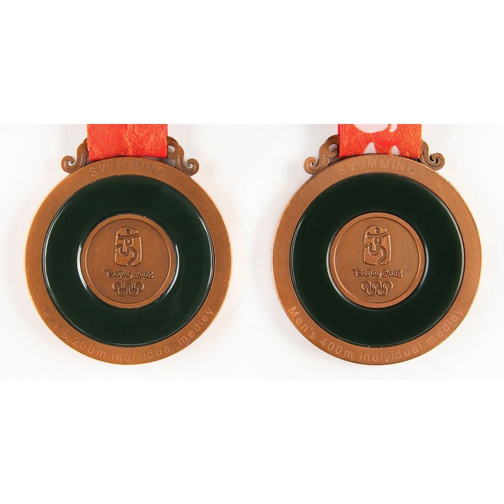 Beautiful pairing of the two bronze winner’s medals that were awarded to legendary American swimmer Ryan Lochte at the Beijing 2008 Summer Olympics—Lochte placed third in the 200-meter individual medley and the 400-meter individual medley. Both medals are bronze with inlaid jade, 70 mm, 163 gm, and were designed and produced by the Medal Design Group, China Central Academy of Fine Arts, Elena Votsi. Created from ancient Chinese jade patterns, the medals consist of bronze and jade, which symbolize nobility and virtue. Jade has been regarded as a virtue since ancient times, and the embodiment of Chinese traditional values of ethics and honor. The medal fronts depict the standing goddess of Victory against panoramic imagery of the Panathenaic Stadium, with text above reading: “XXIX Olympiad Beijing 2008â€; and the reverse of both medals features the Beijing Games emblem surrounded by inlaid jade and the outer circle engraved with the sport, “Swimming, Men’s 200m individual medley†and “Swimming, Men’s 400m individual medley.†The design inspiration of the medal hook derives from jade ‘huang,’ a ceremonial jade piece decorated with a double dragon pattern and ‘Pu,’ the reed mat pattern. Both medals include their original red-and-orange ribbon, as well as their gorgeous red rosewood presentation cases with traditional Chinese brocade boxes, which bear some wear to corners and edges.