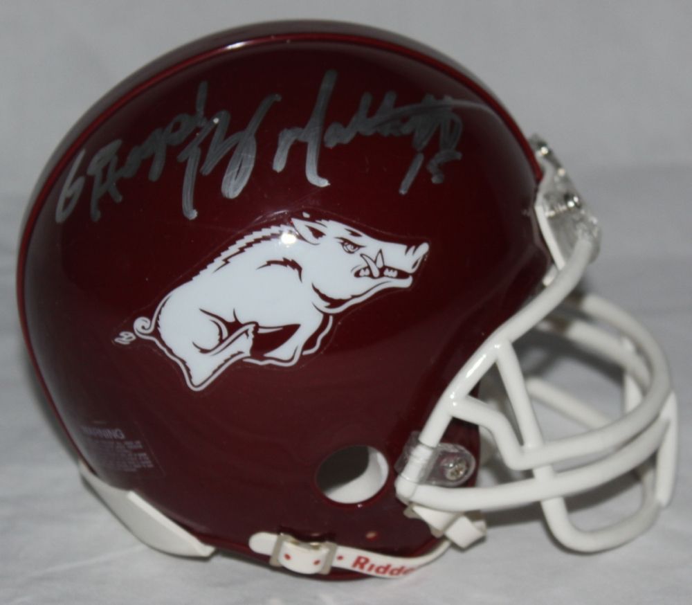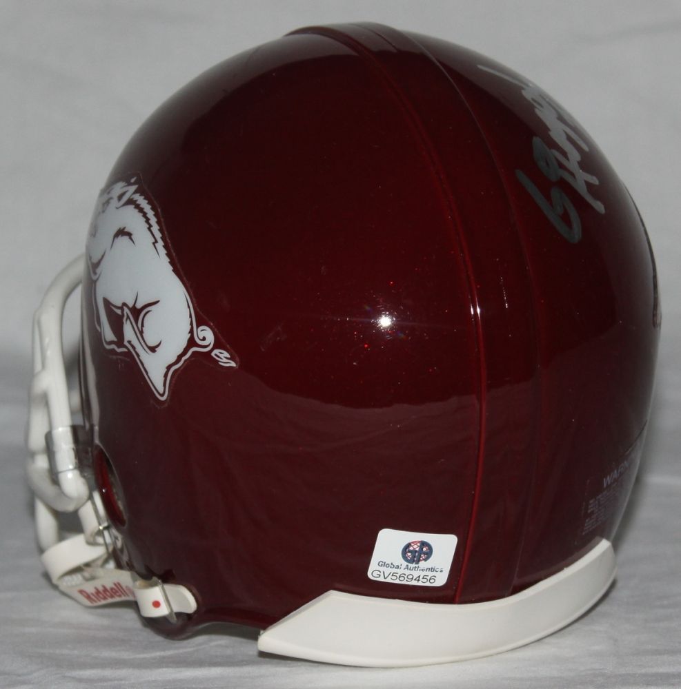 Riddell Arkansas mini-helmet hand-signed in silver paint pen by Ryan Mallett (Patriots). The autograph has been reviewed and authenticated by Global Authentics (GA) and includes their official serially numbered hologram.