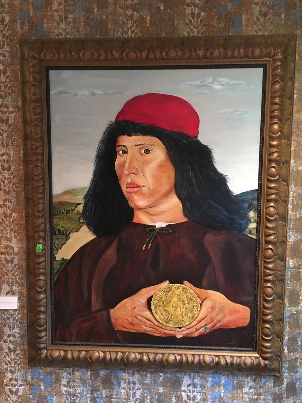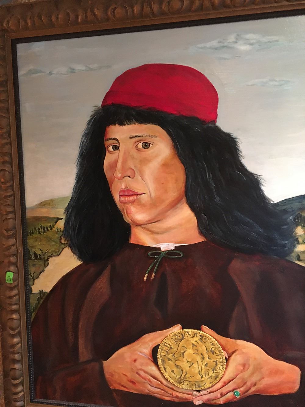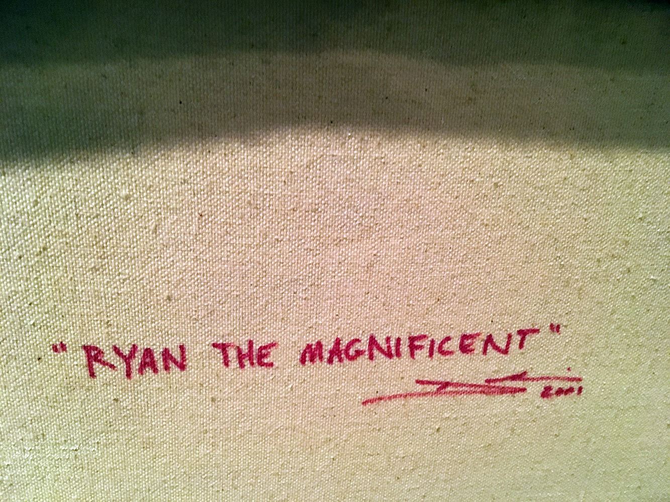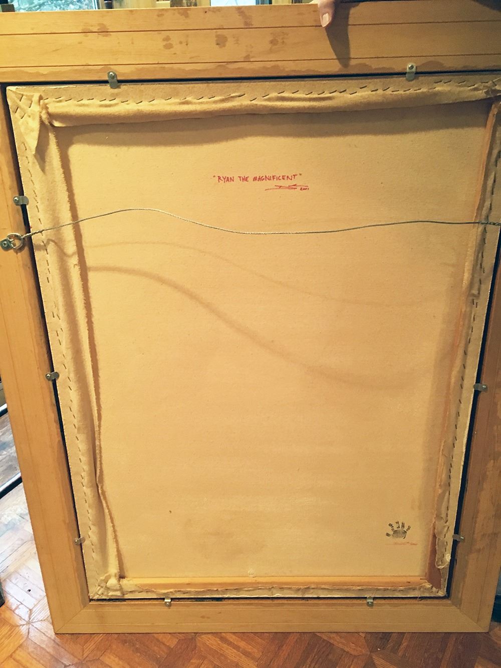 Ryan the Magnificent, from the Portraits of modern day Medici series, oil on canvas with wooden medallion, measures approx. 30 inches x 40 inches. Professionally framed, signed David Szydlowski. A Farmington Valley, CT native, David Szdlowski came alive on the art scene in the late 1990-2000 with showings in the Farmington Valley, CT area and the Wadsworth Atheneum, he also had a gallery in New York City. A modern artist who was known for his prolific work in a style celebrated as Cerebral Art. He seems to have left the art world behind in the early 2000's, as there is no record of his work dating past 2002. A very limited number of his works can now be found on the marketplace, and this piece is from a private collection of Peter DeLeone. Featured in artist's catalog and originally sold for $8,000. pd estate