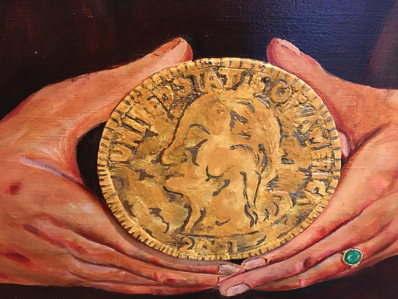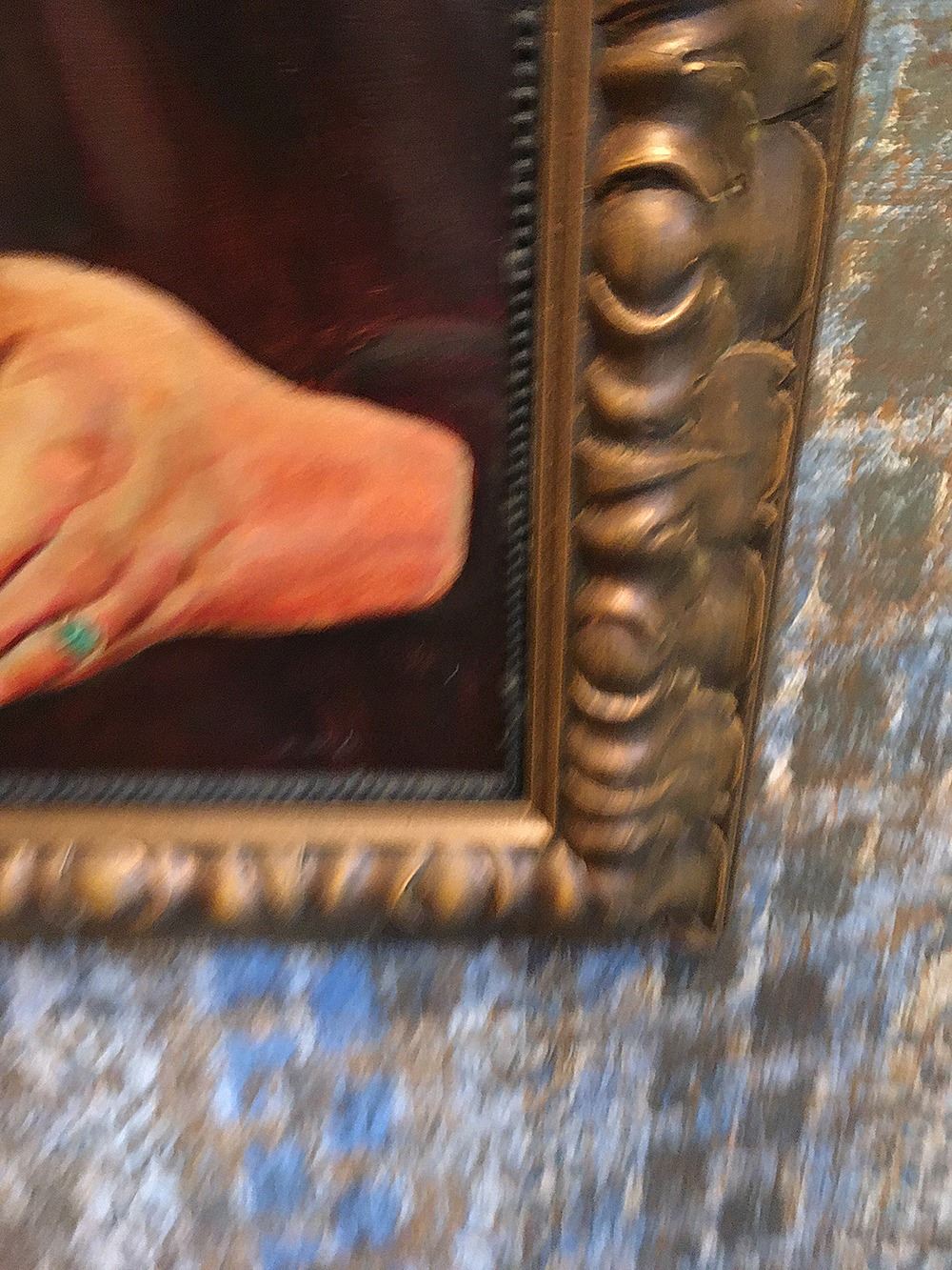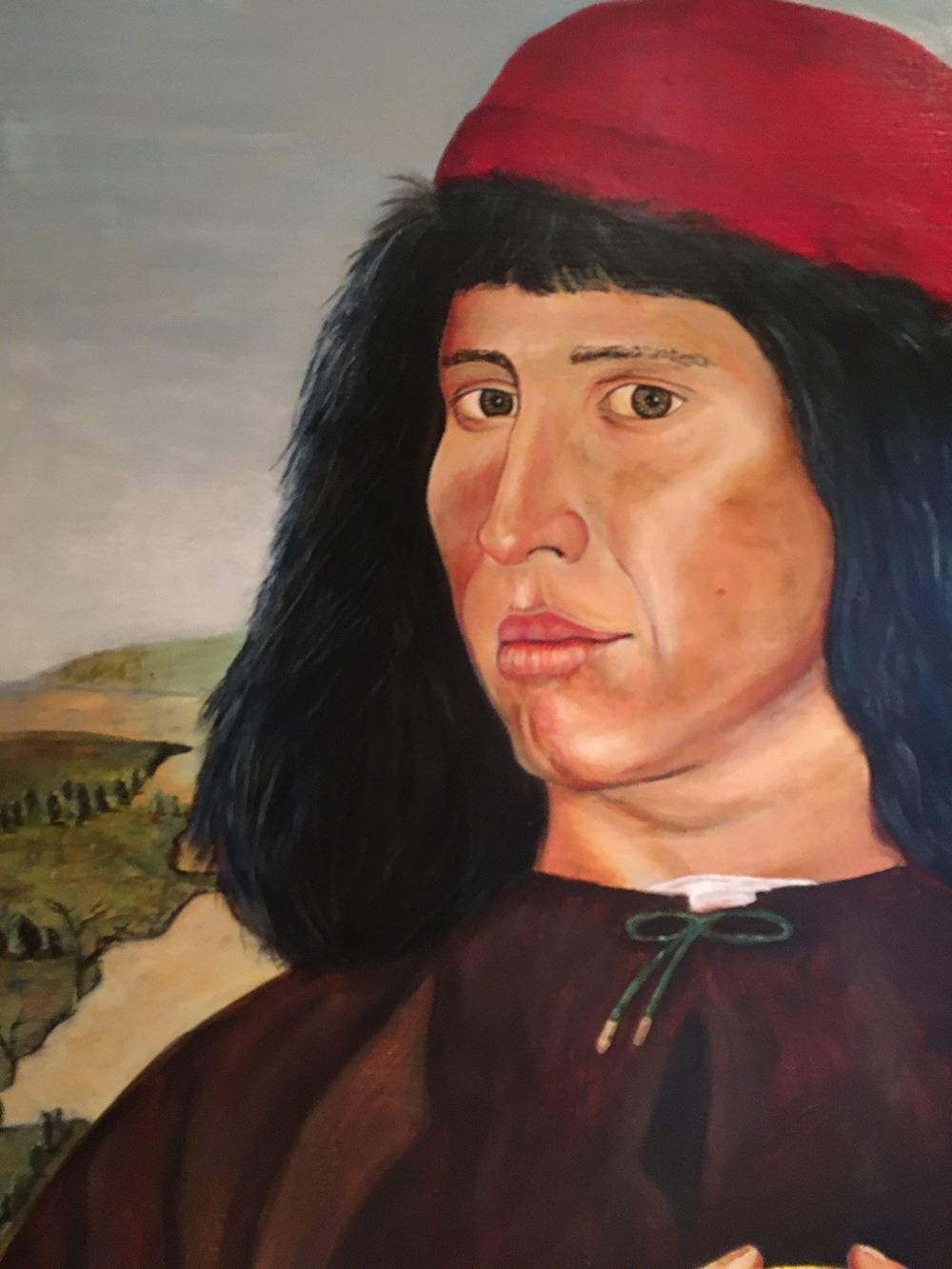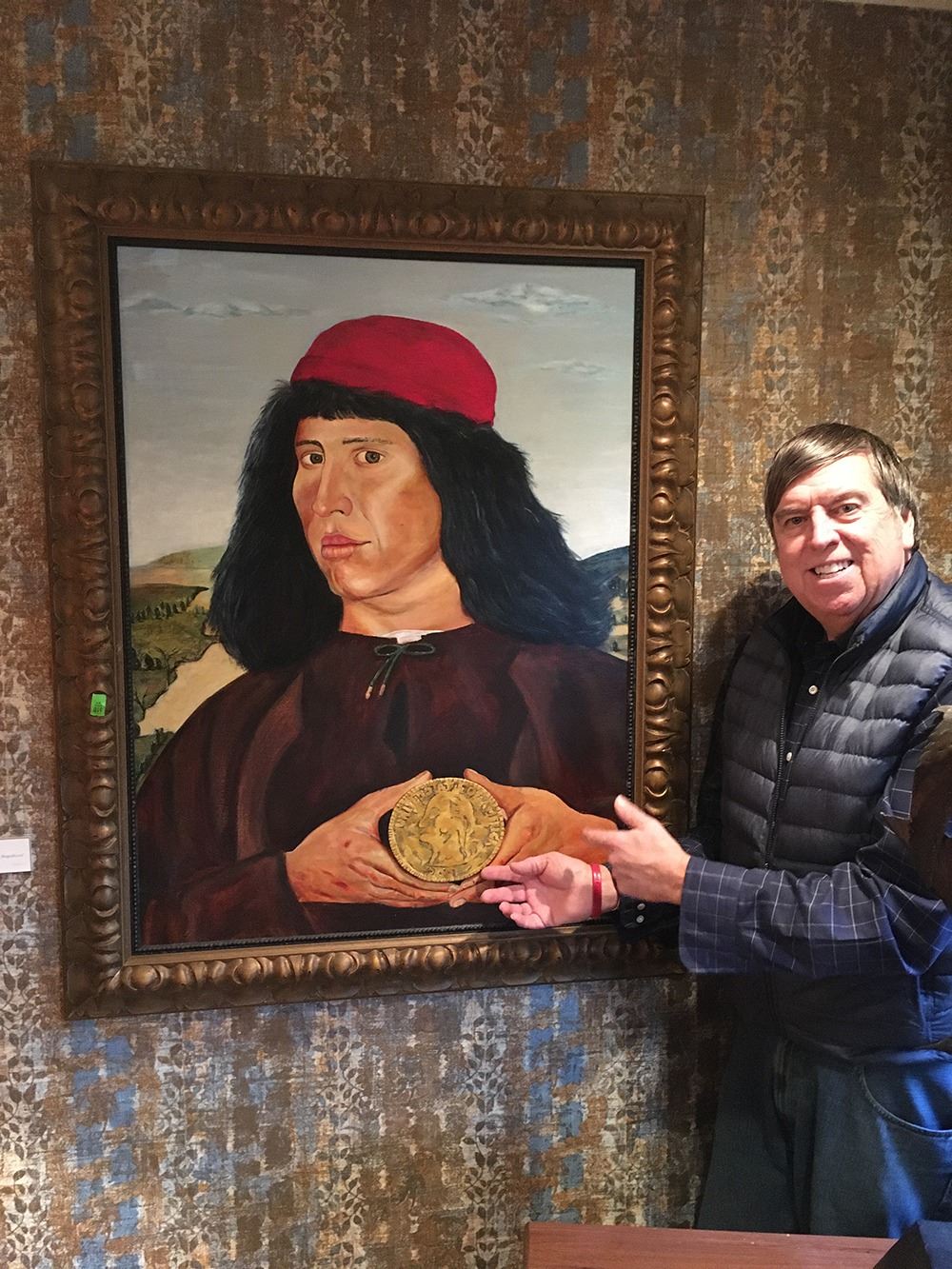 Ryan the Magnificent, from the Portraits of modern day Medici series, oil on canvas with wooden medallion, measures approx. 30 inches x 40 inches. Professionally framed, signed David Szydlowski. A Farmington Valley, CT native, David Szdlowski came alive on the art scene in the late 1990-2000 with showings in the Farmington Valley, CT area and the Wadsworth Atheneum, he also had a gallery in New York City. A modern artist who was known for his prolific work in a style celebrated as Cerebral Art. He seems to have left the art world behind in the early 2000's, as there is no record of his work dating past 2002. A very limited number of his works can now be found on the marketplace, and this piece is from a private collection of Peter DeLeone. Featured in artist's catalog and originally sold for $8,000. pd estate