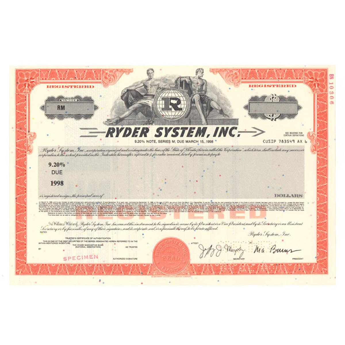 [SPECIMEN] ----, Florida. 9.2% note specimen in Ryder System, Inc. Orange / Black. Vignette of two allegorical males on either side of company logo at top center. Perforation cancellation. Very Fine.