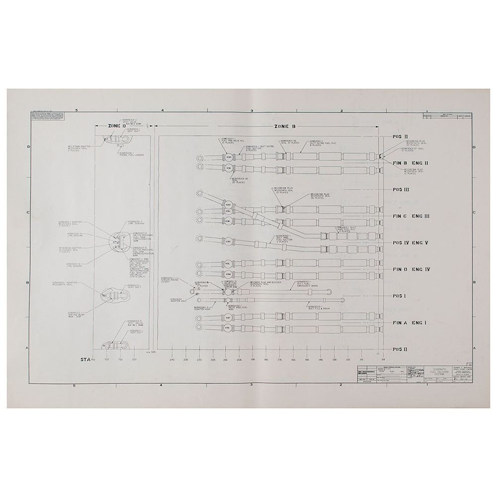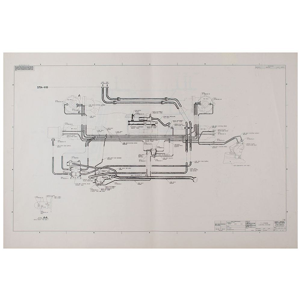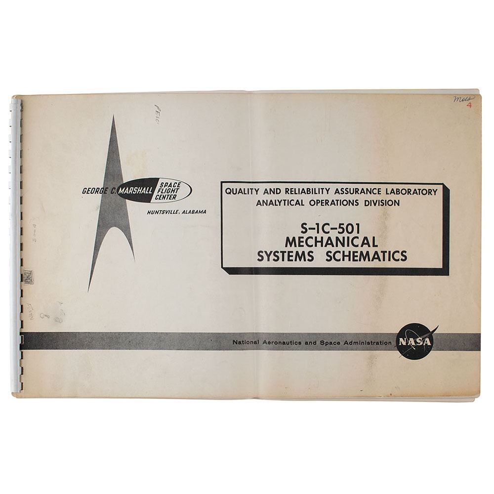 Spiral-bound book from the George C. Marshall Spaceflight Center's Quality and Reliability Assurance Laboratory, Analytical Operations Division, entitled "S-1C-501 Mechanical Systems Schematics," 24 pages, containing large full-page diagrams for a variety of the vehicle's subsystems and components, including: "GN2 Control Pressure System," "Emergency LOX Bubbling System," "Fuel Tank Bubbling System," "Fuel Pressurization System, Helium," "Hydraulic Control and Prefill System," "LOX Pressurization System," "Fuel Delivery System," "Pressure Switches and Calibration Lines," "Umbilical Plates," and "F-1 Engine Control System," and "Servo Actuator & Heat Exchanger Systems." In fine condition, with soiling and toning the the covers; interior pages are all clean.
