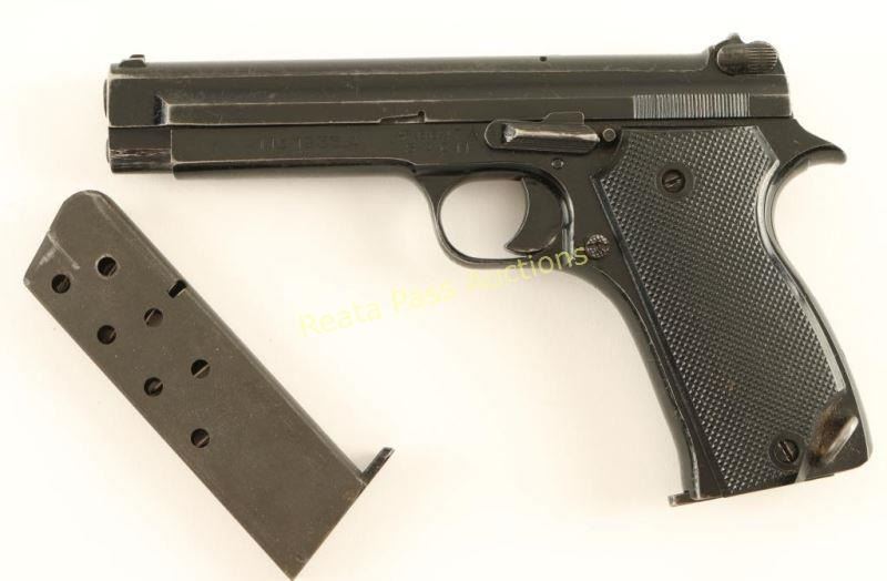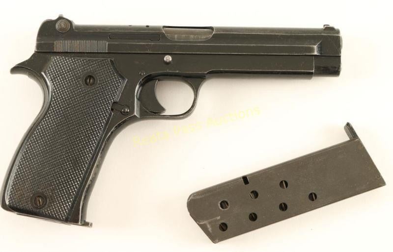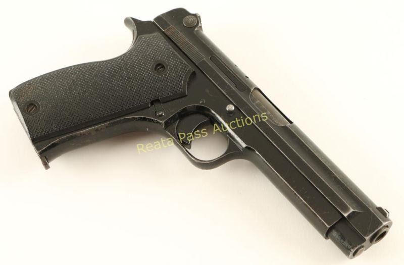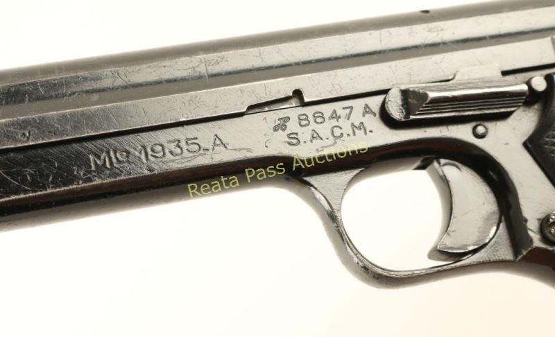 French military single-action semi automatic service pistol chambered in 7.65mm French Long, circa 1935-1940. Features a black finish, 4.3" barrel, dovetailed blade front sight, notched rear window sight, steel frame, manual safety, smooth trigger, serrated round hammer spur, push button magazine release, 8 round magazine, lanyard loop, magazine safety and two-piece checkered black hard rubber grips. Includes a spare magazine. No import marks. Markings: Frame - "Mle 1935_A", "X8647A", & "S.A.C.M.". Magazines - stamped "35_A" on the floorplates. Pistol retains approximately 78% of it's black finish showing moderate handle marks and edge wear. Action is smooth, bore is very good and grips are very good. Condition is very good. ***C&R Firearm*** ***Modern Firearm***