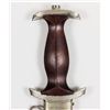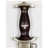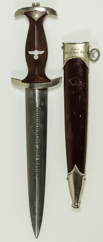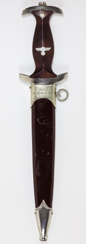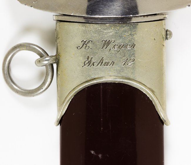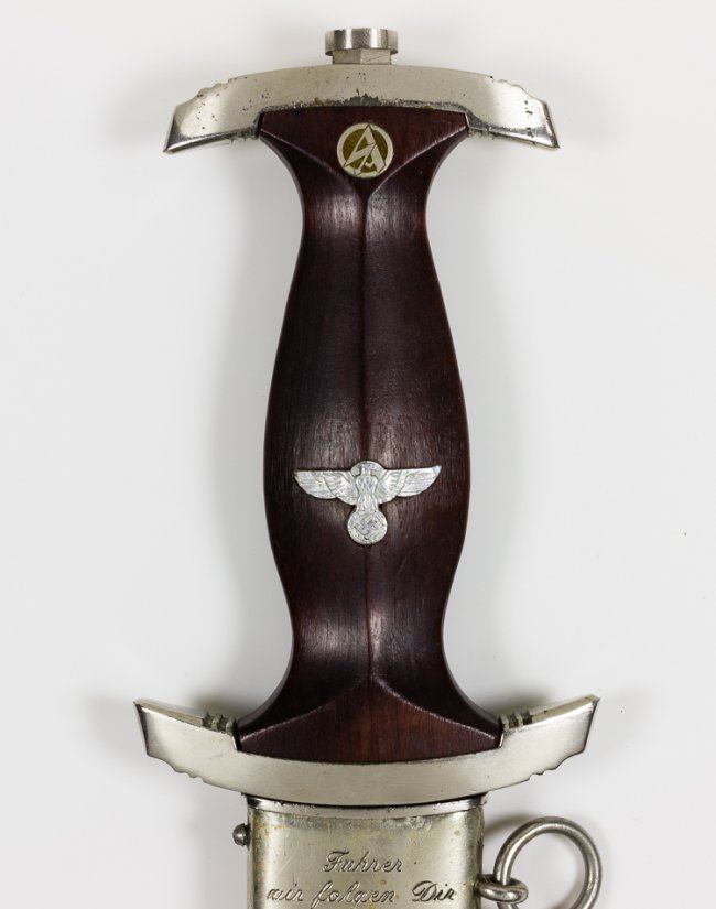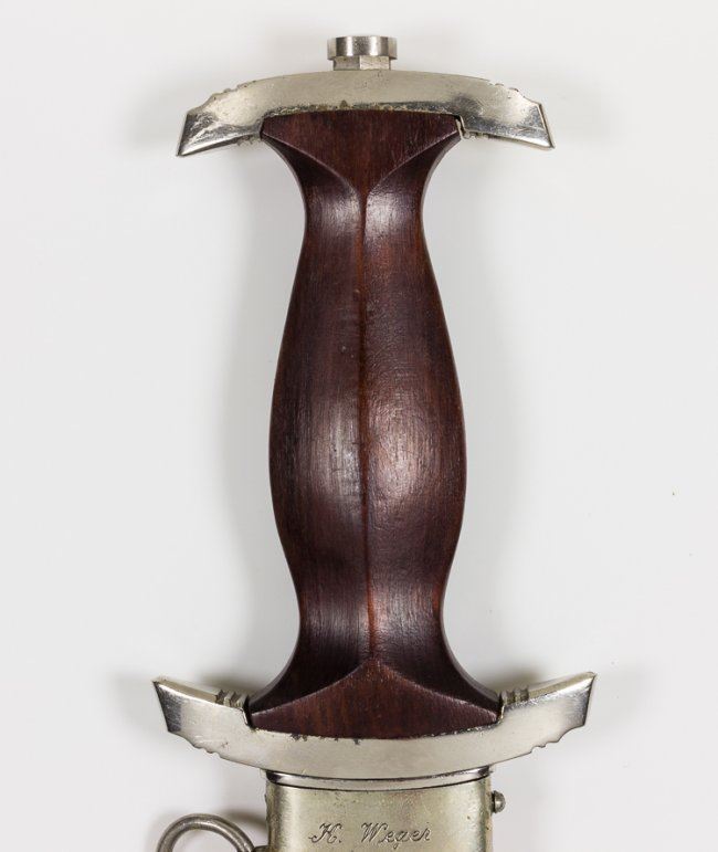 Excellent personalized S.A. dagger with brown wood grip inset with S.A runes button with unblemished enamel, and an eagle and swastika device, both of which are perfectly fitted. The wood of the grip itself is near perfect, and the plated cross guards still retain a good edge, but have a little bit of corrosion where they meet the wood grip in a near-perfect fit. The blade is excellent with only slight running marks. The fine etching of the S.A. motto "Alles fur Deutschland" ("Everything for Germany") is deep and remains dark. On the verso the blade features the "RZM M7/37" approval stamp indicating the dagger was made by Pumawerke. The brown scabbard fits perfectly, with all the nickel screws in place, no dents or dings and only a few tiny surface scratches. The top chromed band is additionally engraved in German in a period hand: "Fuhrer we follow you" with the reverse bearing the owner's name and S.A. affiliation: "K. Weger Schar 12". A great dagger!