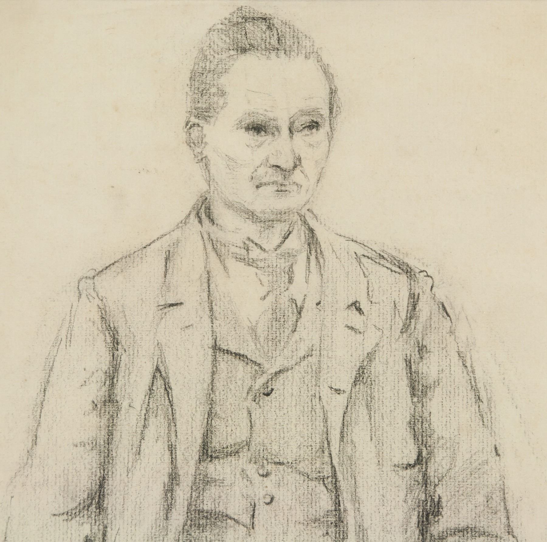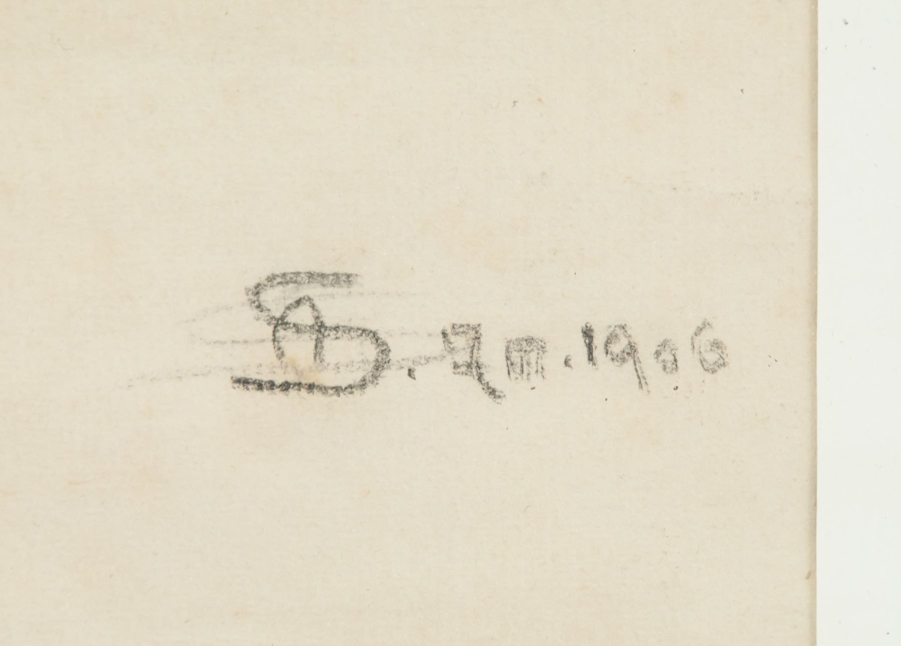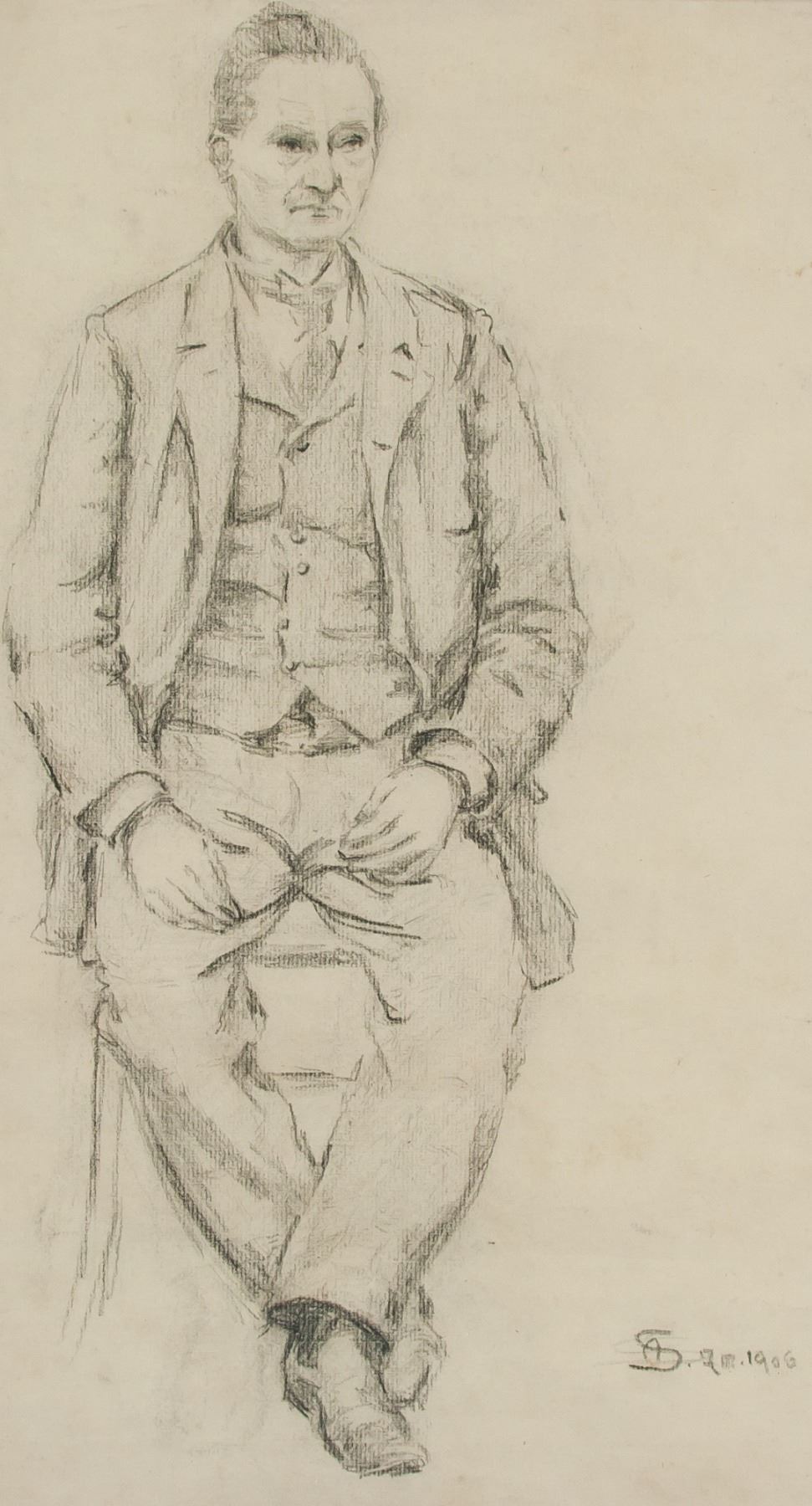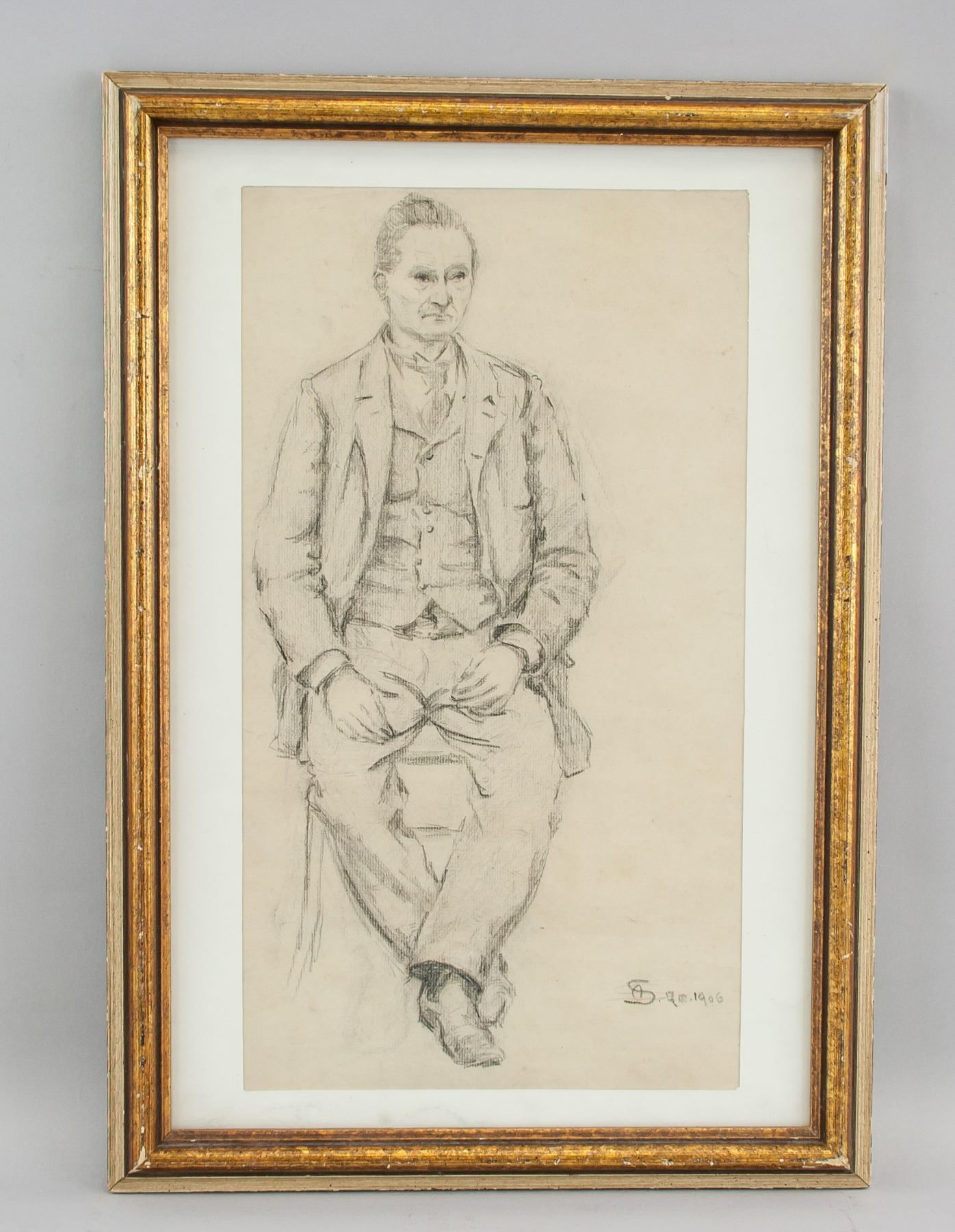 Pencil on paper, featuring portrait of a sitting man framed. Signed on the lower right corner , dated 1906. 16 x 9 inch, 40 x 24 cm