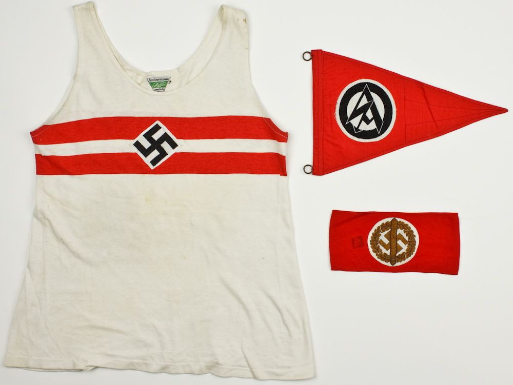 Good lot of three items includes an S.A. car pennant, 12 1/2" long with emblem sewn-on, RZM tag still attached, fine condition, S.A. sports instructor's armband with RZM tag within, one small rectangular stain else fine, and a Hitler Youth sports shirt, a few stains and repaired holes.
