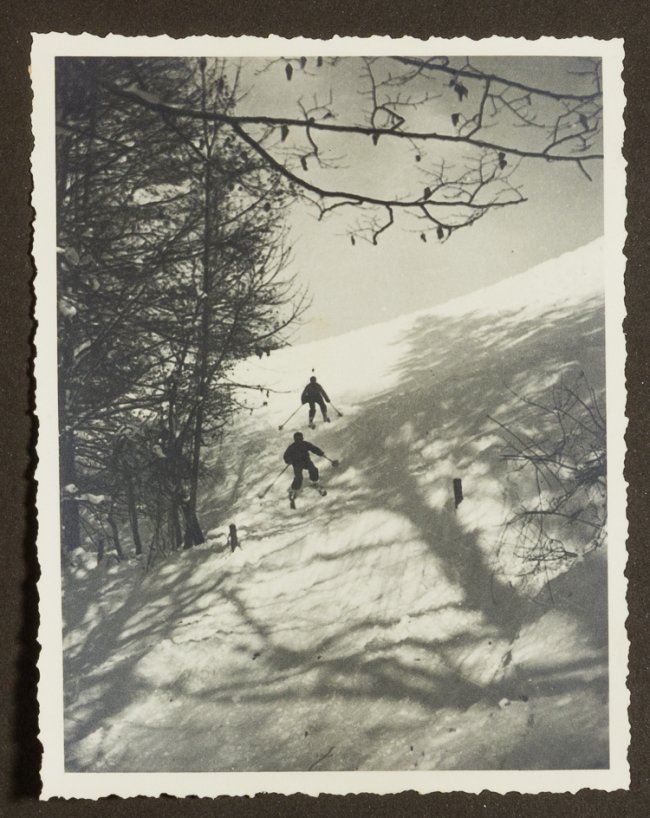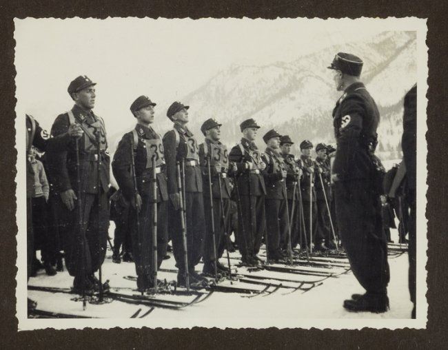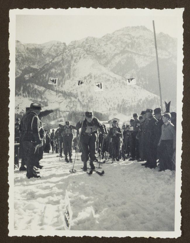 Photograph album containing about forty photographs from an S.A. winter sports competition held at Bad Reichenhall in 1934. The 11" x 7 ?" album, presented to "Brigadefuhrer Hermann", presents the 4 ?" x 3 ?" images one per page. Subjects include the S.A. men on skis and in uniform under review, cross-country and downhill competitions, ski-jumping, finish lines, awards ceremonies, etc. Faux leather cover is stained, else very good.