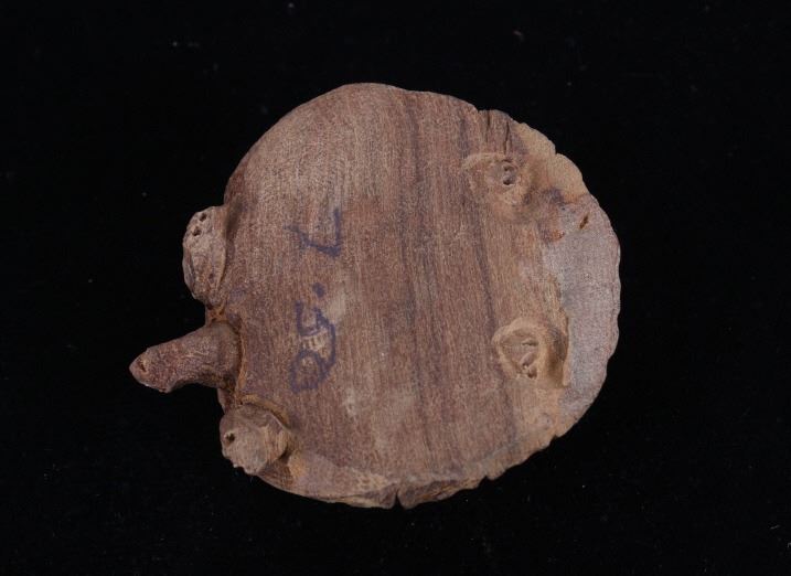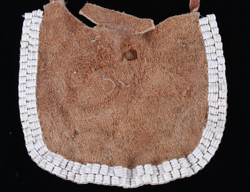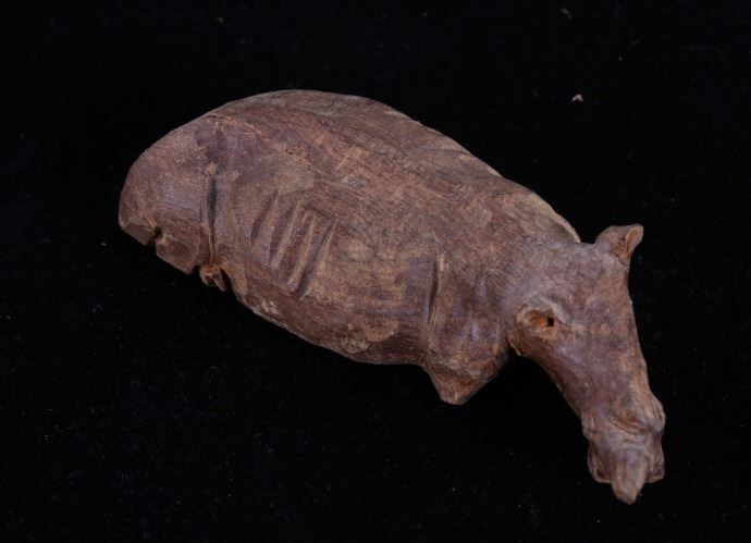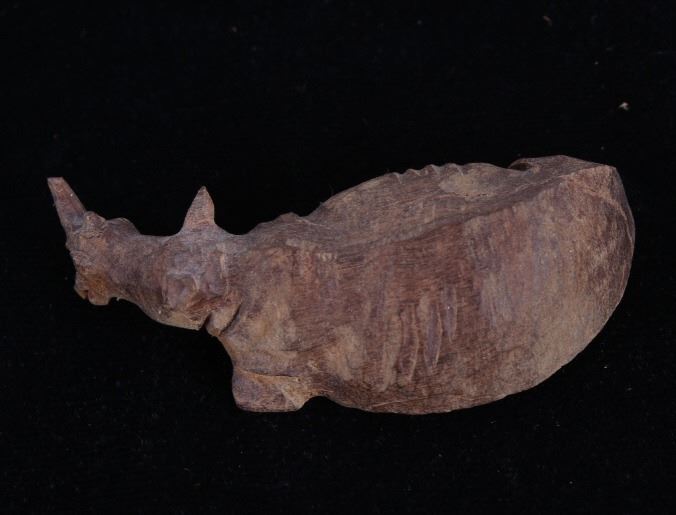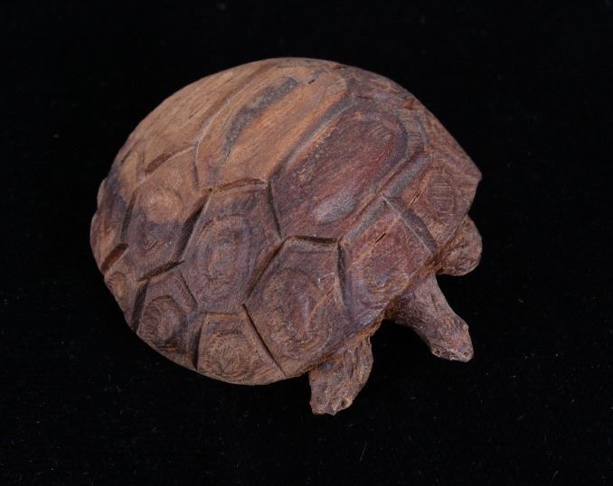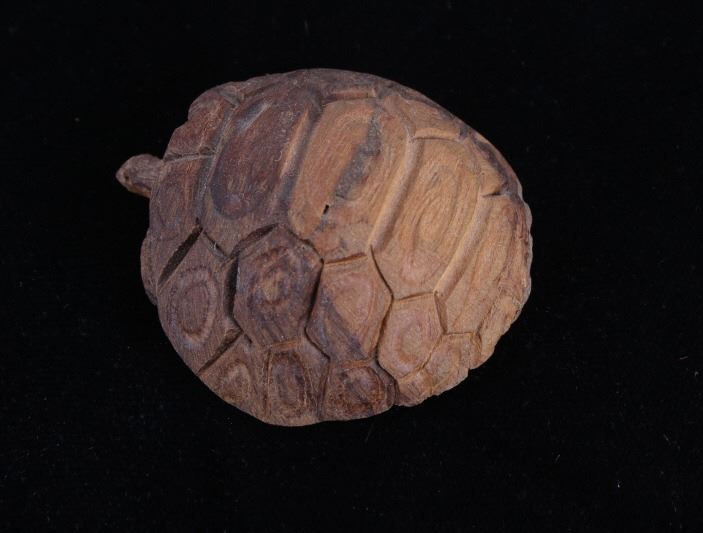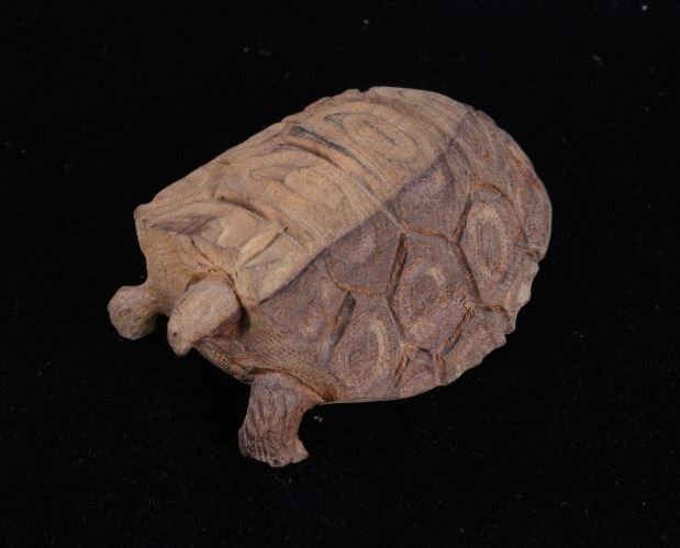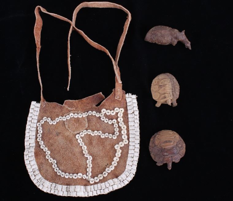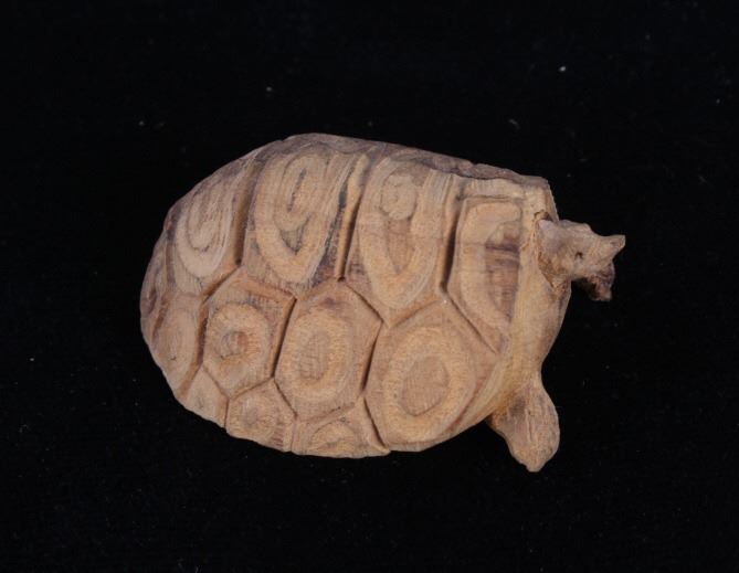 Offered in this lot is a collection of three wooden Bushman carved toys and a child's loincloth. The carved toys are of two turtles/tortoise and a rhinoceros. The toys are carved from wood with flat bottoms and measure an average of 2" X 2" X 1". For such small carvings, they have distinct detail, as one turtle has a pointed nose like an African Sideneck Turtle and one has the long, wrinkled neck of an African Spurred Tortoise. The child's loincloth is made of a ruff leather and decorated with white stone disk beads. The loincloth measures 6 1/4" X 5 1/4" and the ties are 29" long from end to end. All these items are in good condition.