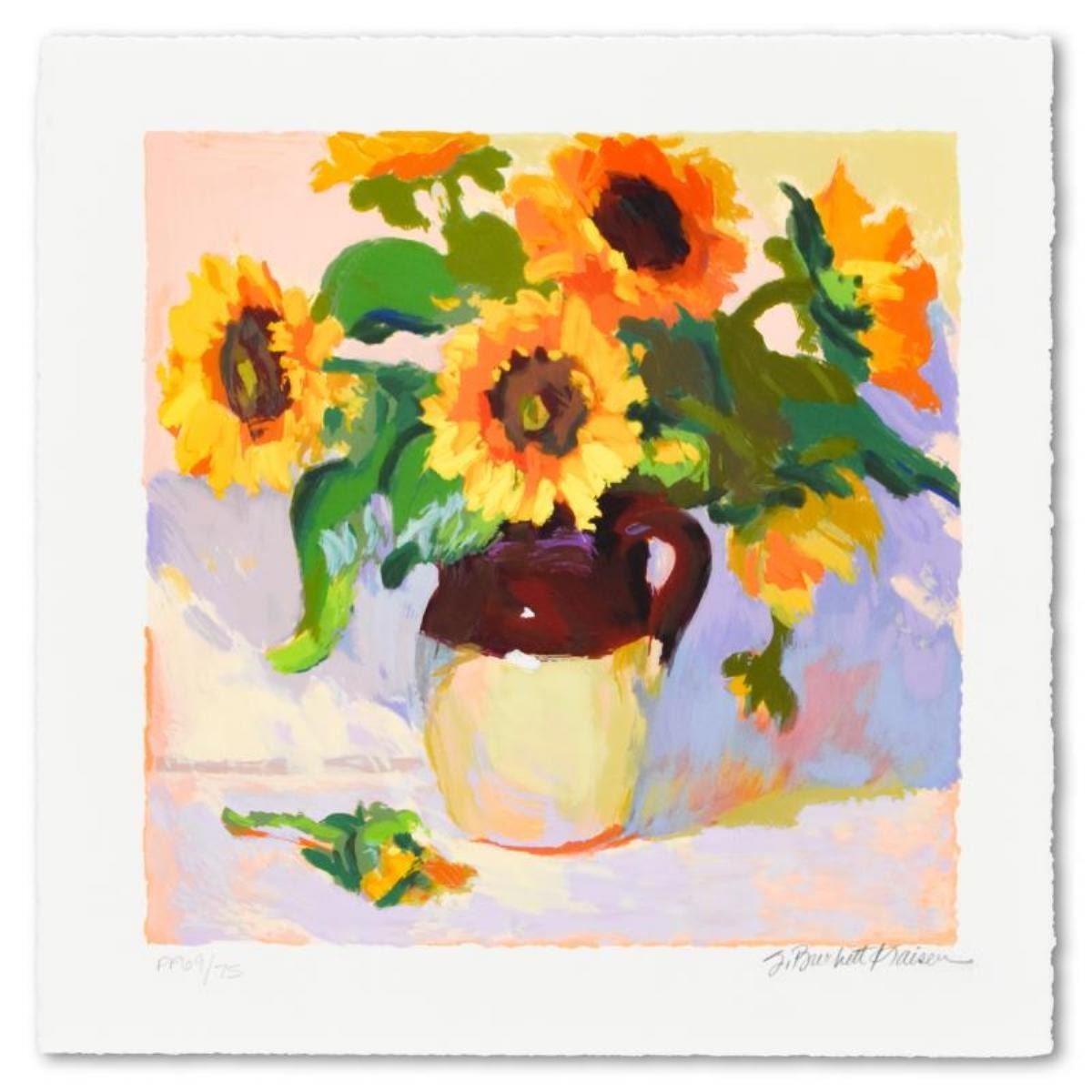"Sunflowers" is a limited edition giclee on paper by S. Burkett Kaiser, numbered and hand signed by the artist. Includes Letter of Authenticity. Measures approx. 15" x 15" (border), 12" x 12" (image).