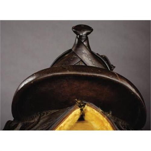 <B>S.C. GALLUP SADDLE, PUEBLO, COLORADO ½ SEAT Circa 1890's</B></I> - Square skirts with built-in saddle pockets; Cheyenne roll; Sam Stagg rig; “JWC” stamped in seat; brass-bound oxbow stirrups. <BR><BR><B>Condition:</B></I> Very good condition; sharp edges; relined; horn cover re-stitched.<BR><BR><b>Shipping:</b> Other (oversized items, group lo (<a target="_blank" href="http://www.heritageauctions.com/common/shipping.php">view shipping information</a>)
