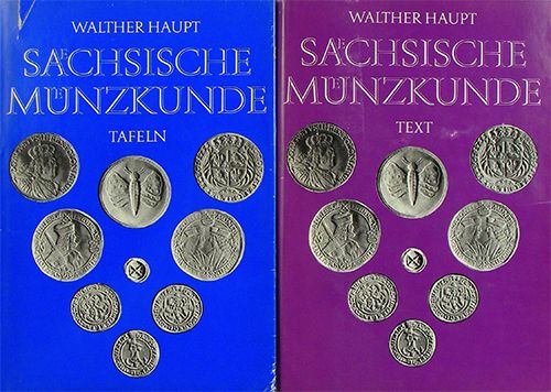 Haupt, Walther. SÄCHSISCHE MÜNZKUNDE. Hamburg, 1974. Two volumes. Tall 8vo, original matching white printed linen; jackets. 301, (1), (4) pages; text illustrations; maps; 141 plates with facing text. Some wear to jackets; near fine. Infrequently offered. Clain-Stefanelli 9542.