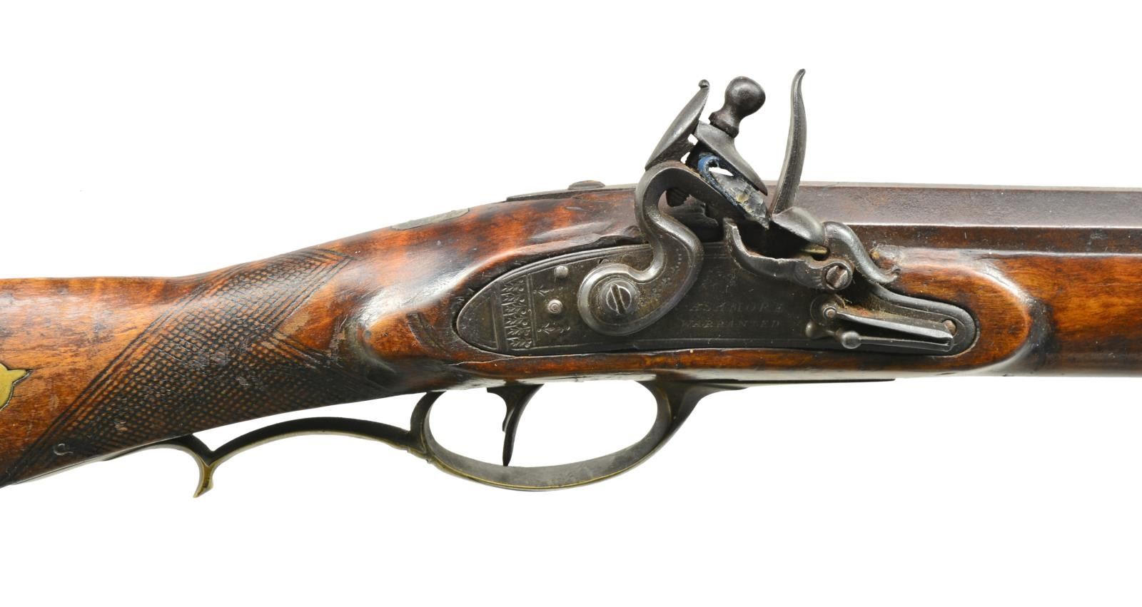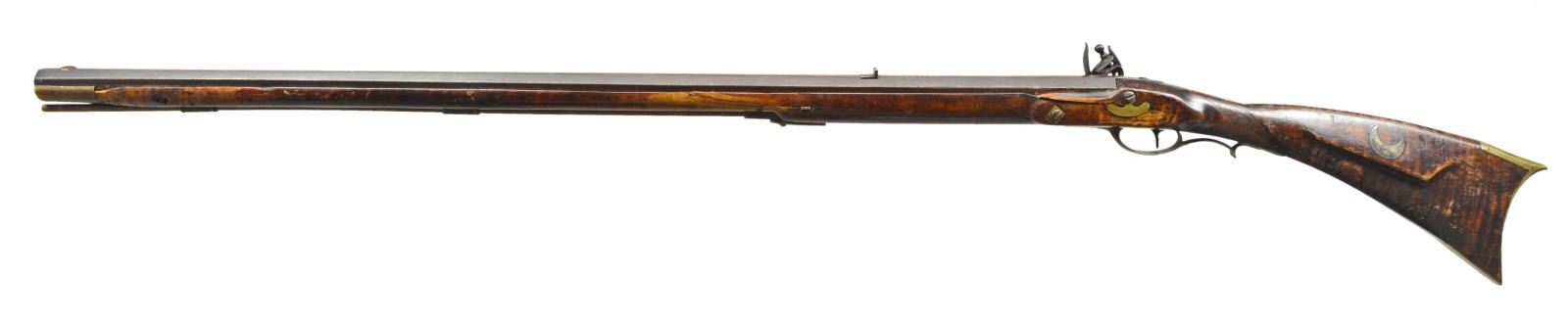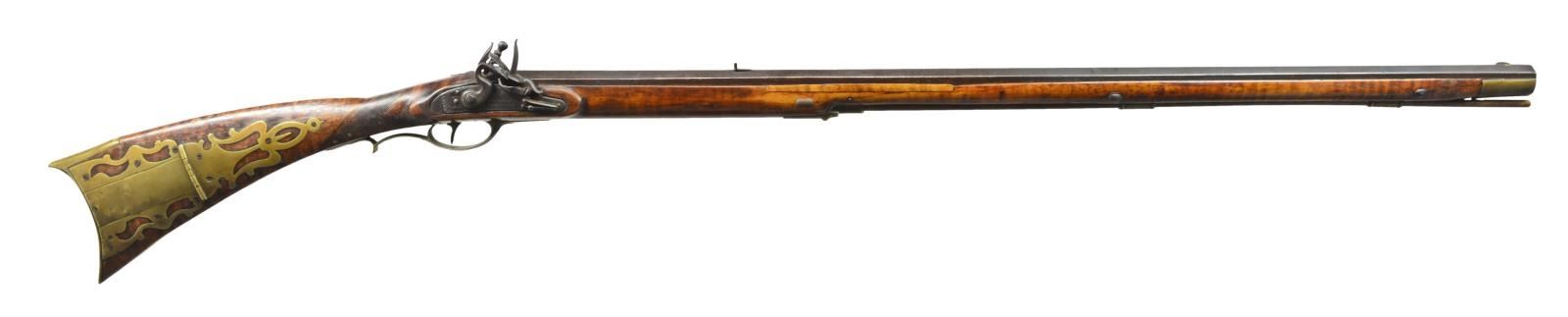 1815. Cal. 48. NSN. 53" Overall. Bbl. 37" oct. w/ fixed iron notch rear sight & brass blade front sight, stamped “S. COGSWELL / TROY”. Scarce New York made long rifle in Pennsylvania style, brass mounted, 4 piece pierced patch box, “ASHMORE” trade lock, silver crescent moon inset on cheekpiece w/ sm. void rectangular thumbplate. CONDITION: good to very good overall, bbl. & lock have dark iron patina w/ good markings. Brass has medium mustard patina. Stock is refinished w/ several glued insets & break repair under lock. Mechanically fine w/ good rifled bore. PROVENANCE: From the Collection of John "Tim" Breth Jr. (01-17780/JS). ANTIQUE. $2,000-3,000.