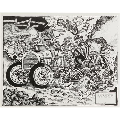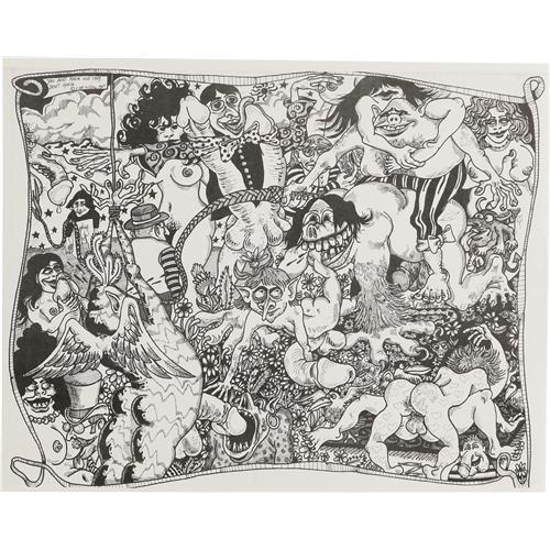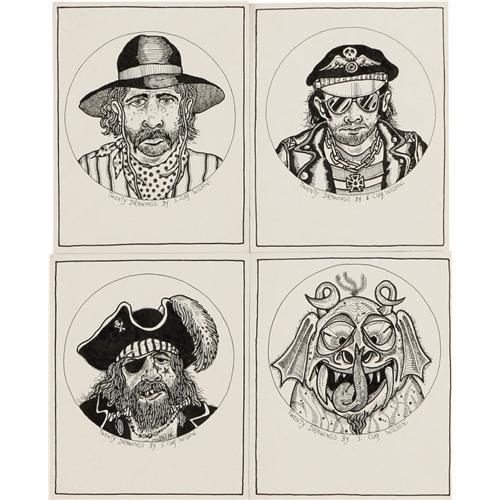 "<B>S. Clay Wilson - Twenty Drawings Portfolio Special Edition with Original Art (The Abington Book Shop, 1967).</B></I> Underground comix pioneer S. Clay Wilson, a veteran of publications <B>Zap Comix</B></I>, and <B>Playboy</B></I>, refers to his complex ink drawings as his ""dense-pack style."" This incredibly rare portfolio of Wilson's early drawings, long out of print, contains not only the twenty black and white plates, but also the four original ink drawings by Wilson that were used as cover illustrations on the portfolio envelope. The portfolio was issued in 1967 with around 100 or so copies of each cover, and a special edition of 25 featuring all 4 drawings. The specimen offered here is the granddaddy of 'em all, and had the original four drawings themselves attached to the cover, making this a one-of-a-kind item! This portfolio also includes the letter from the publisher to order extra copies, which fell out of most portfolios. The plates measure 14"" x 11"" and each original drawing measures 4"" x 5"". The portfolio envelope has some major edge wear, and the original art drawings have since been removed and placed inside; otherwise the condition is Good. The plates and original drawings are in Excellent condition. If S. Clay Wilson is your cup of tea, rest assured you'll love this tasty treat! <I>From the collection of Jesse Edwards/JES Archives.</B></I><BR><BR><b>Shipping:</b> Small Flat (<a target=""_blank"" href=""http://www.heritageauctions.com/common/shipping.php"">view shipping information</a>) "
