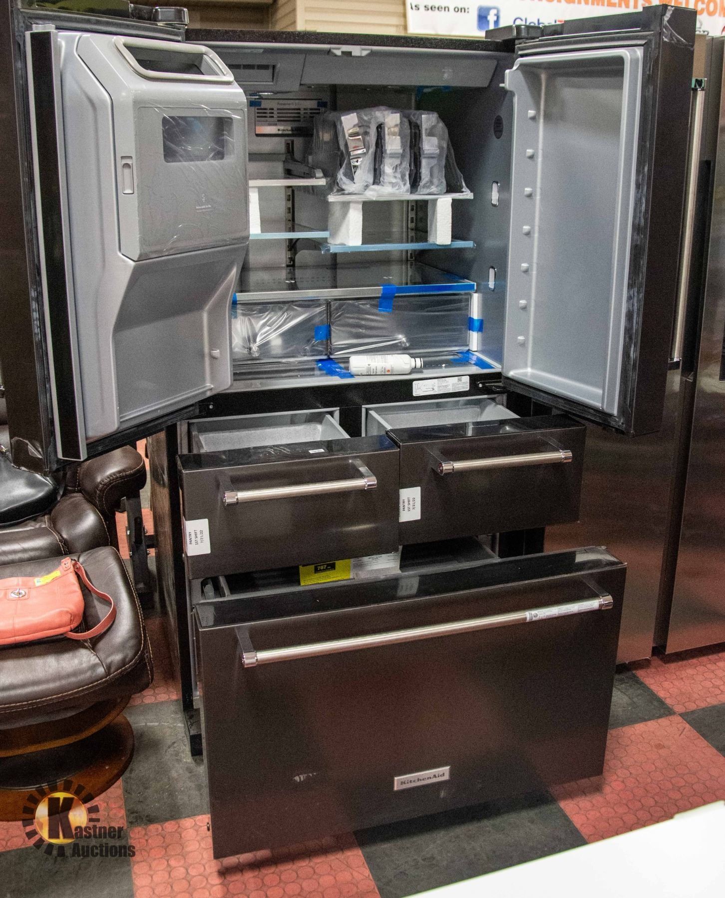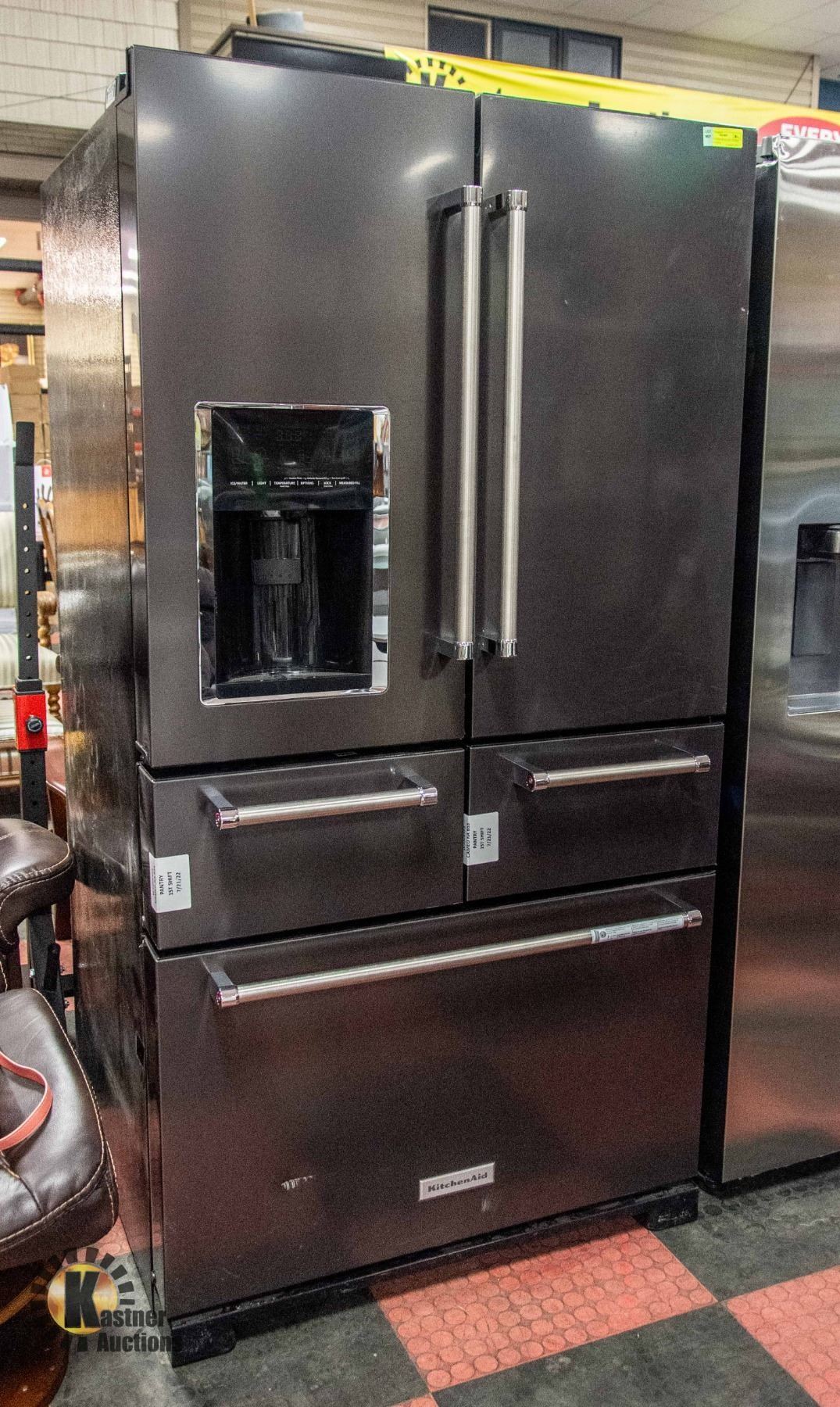 REFRIGERATOR, ICE/WATER DISPENSER, TWO SEPARATE CRISPER DRAWERS. MODEL KRMF706EB505. RETAILS FOR $5,199.00 **ALL ITEMS MUST BE REMOVED BY 5PM SATURDAY, APRIL 29TH 2023. ALL REMAINING ITEMS WILL BE SUBJECT TO A $6.00 PER DAY STORAGE CHARGE. ANY ITEMS REMAINING AFTER MONDAY, MAY 15TH, 2023 WILL BE CONSIDERED FORFEITED. NO REFUNDS WILL BE ISSUED FOR FORFEITED ITEMS. TO SCHEDULE A PICK UP APPOINTMENT CLICK HERE