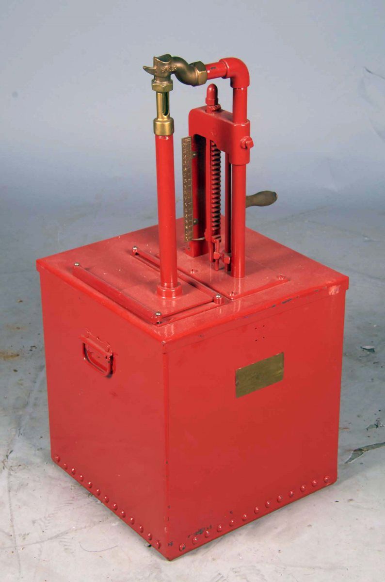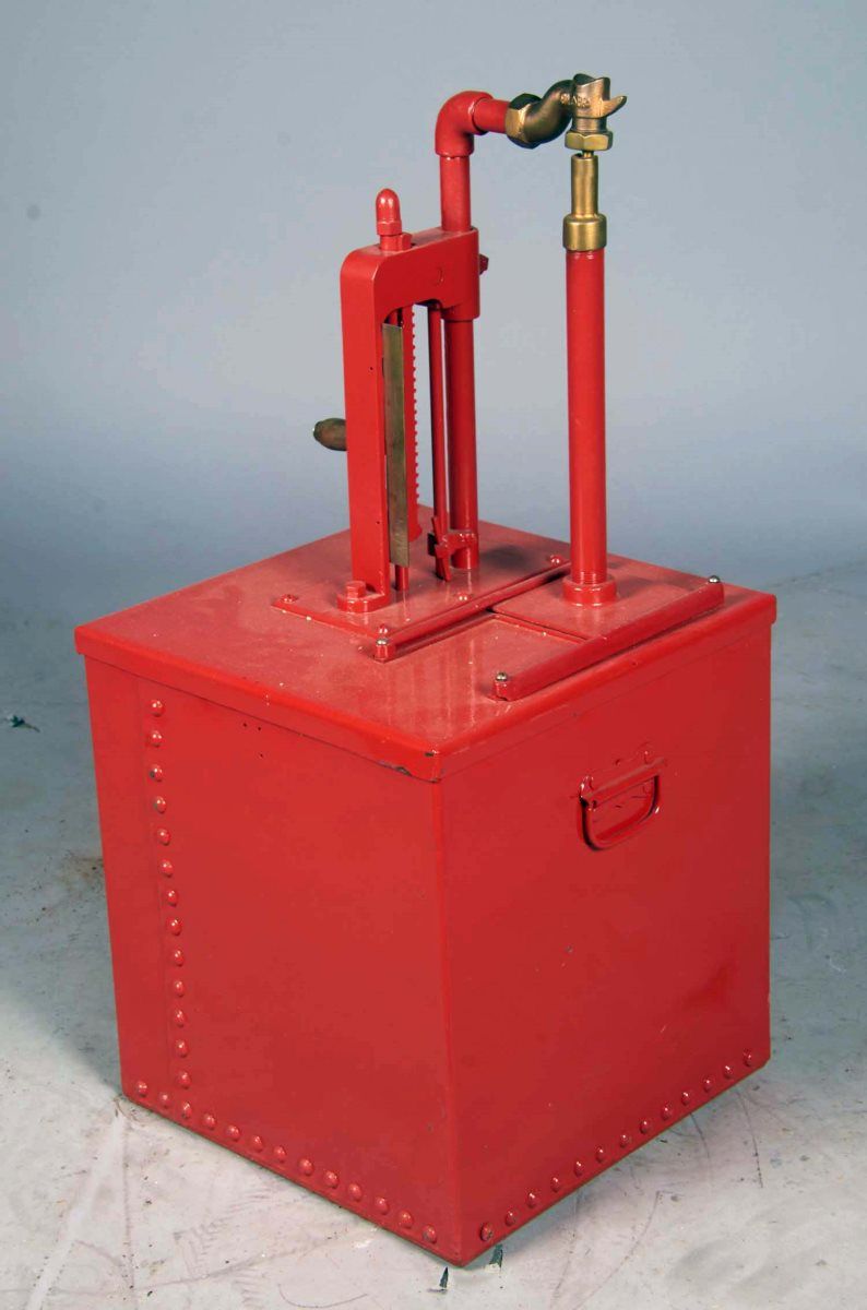 Restored red with original front plaque indicating pump number E8821, Fort Wayne, Indiana, U.S.A. This type of manual crank tank was trademarked 1913. Condition (Excellent). Size 30" x 14.5" x 14.5".