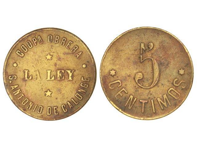 S/F. COOPERATIVA OBRERA LA LEY-SAN ANTONIO DE CALONGE-CALONGE. Latón. (Oxidaciones, pequeños golpecitos y rayas). L-2103. MBC.