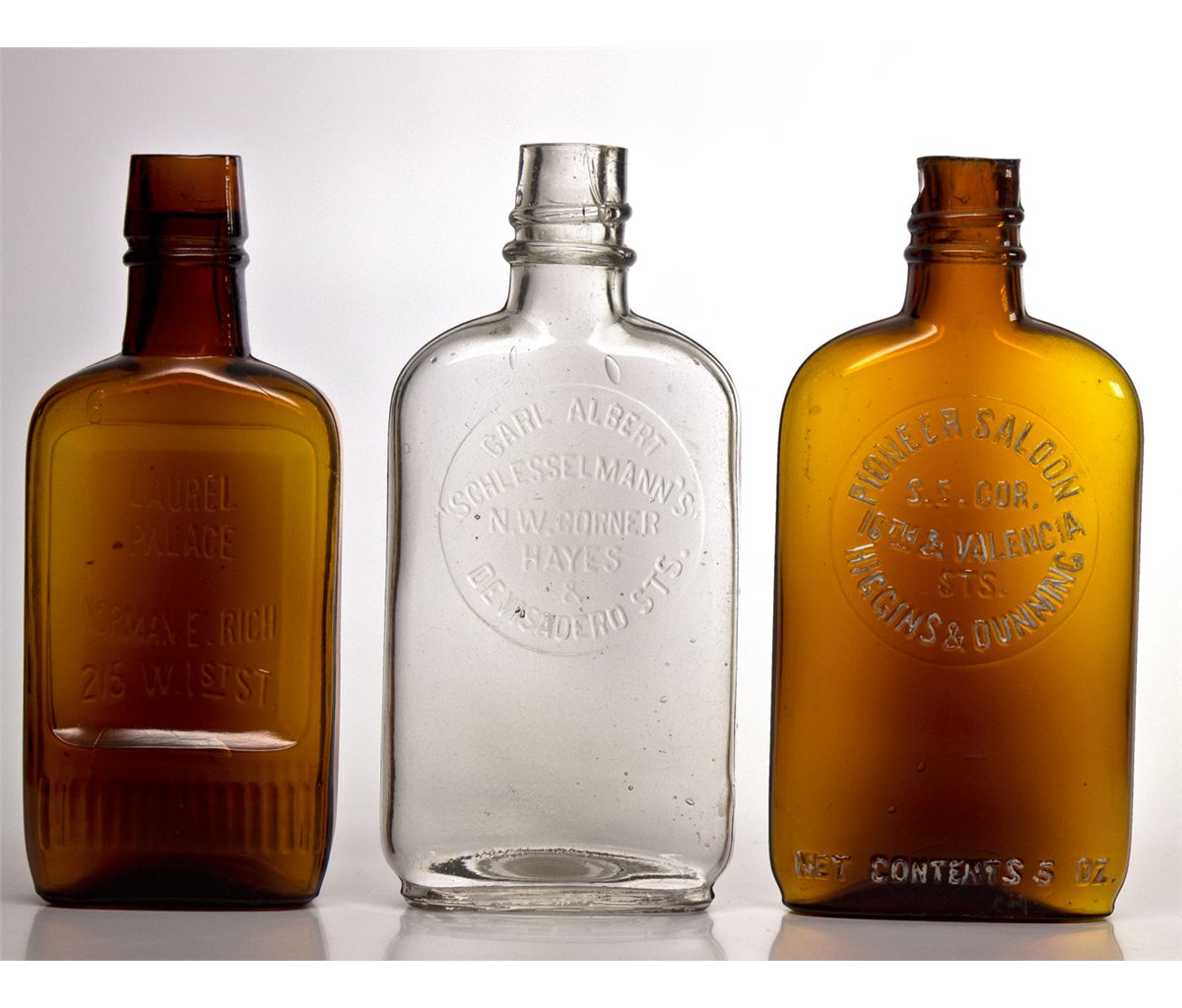 Lot of 3: 1) CARL ALBERT SCHLESSELMANN`S N.W. CORNER HAYES & DEVISADERO STS. Half pint clear glass shoo fly pocket flask. Piece has screw top with un-ground spout and a footed base with rough edges and air vents in the shoulders. 2) PIONEER SALOON S.F. CORNER 16TH & VALENCIA STS. HIGGINS & DUNNING. Five ounce amber shoo fly pocket flask with footed base and screw top. Several chips on spout and rough spots along the footing. Listed in Wilson, not in Thomas. 3) LAUREL PALACE NORMAN E. RICH 215 W. 1ST ST. Half pint, amber shoo fly pocket flask. Top is neatly applied single collar, base is indented style. This is the Laurel palace located in Los Angeles, which would be a nice match with the amber fifth from the Laurel Palace in San Francisco. In impeccable condition for a bottle from around 1910. - Feisel Collection -59284