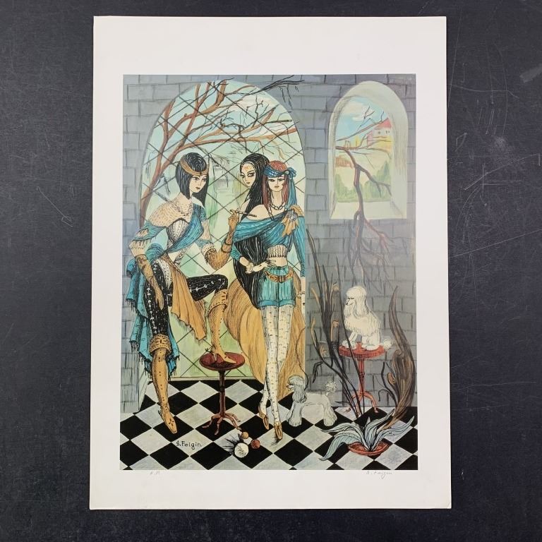 S. Feigin, Untitled, Limited Edition Print. Several women stand inside the grey brick structure while their little poodles look on. This piece is signed in the lower right and numbered AP in the lower left. There is a small dog-ear in the upper left corner does not affect the image and otherwise, it is in very good condition