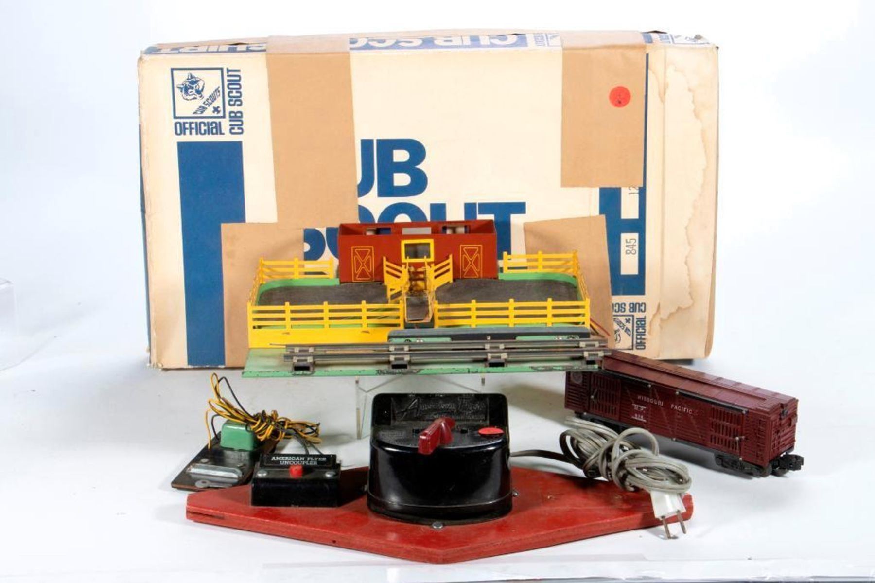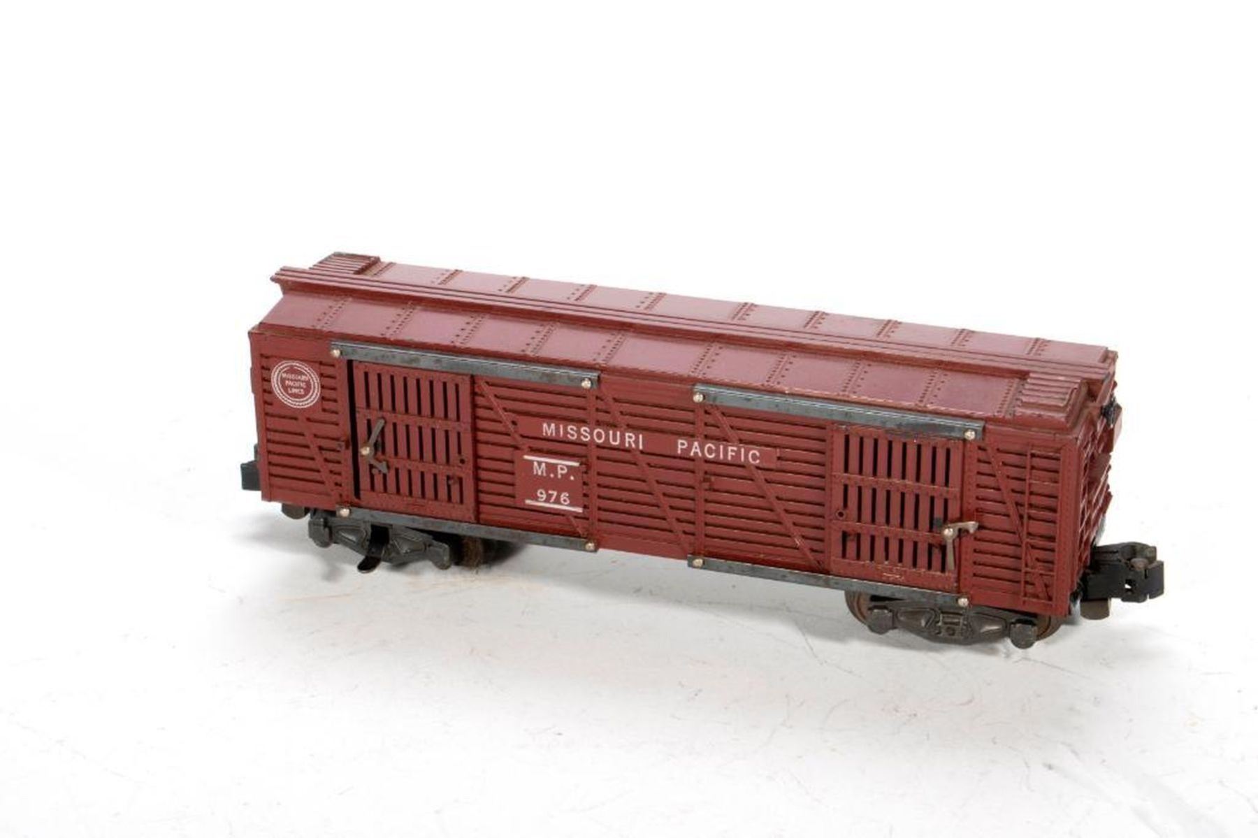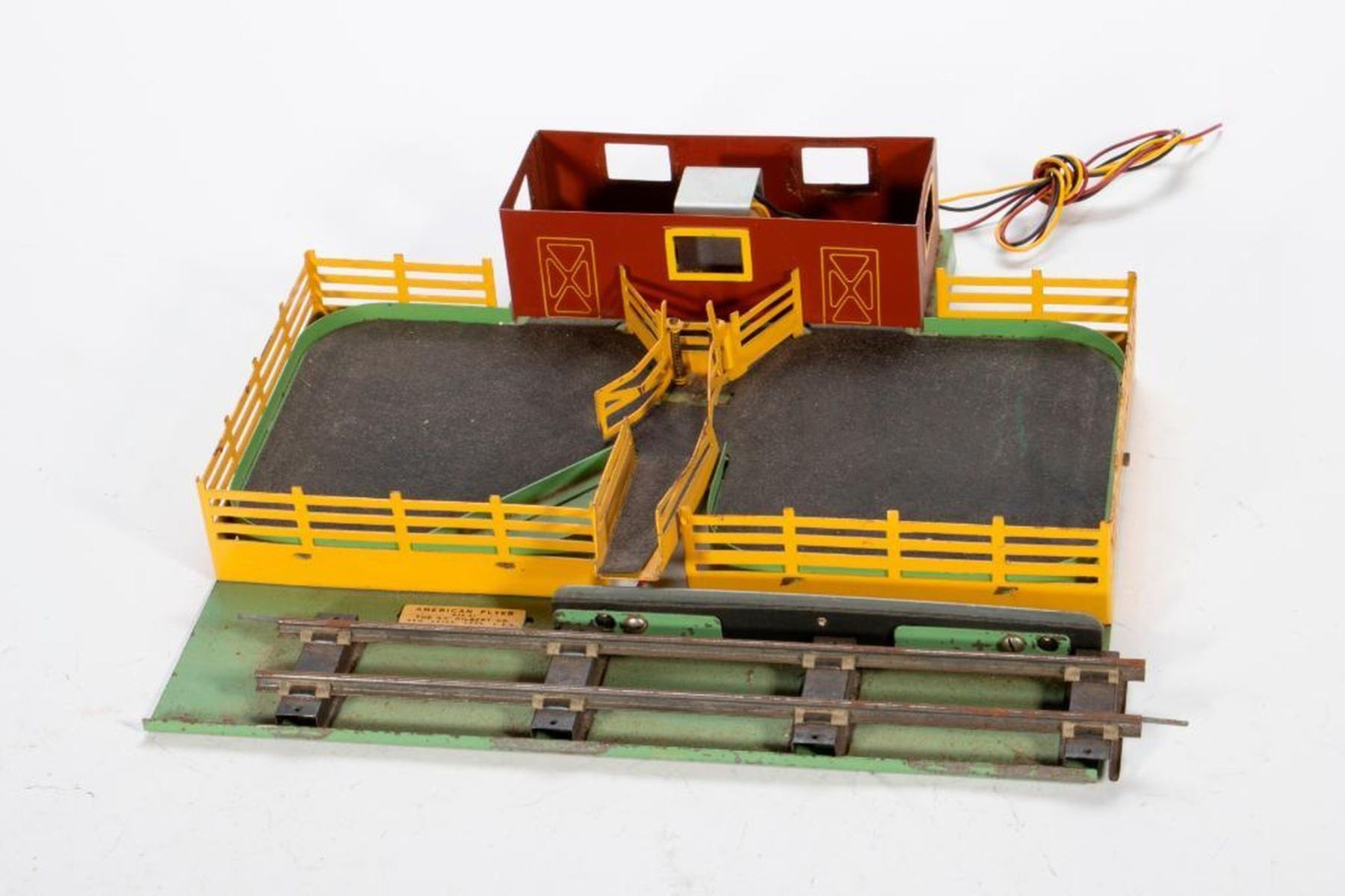 Three rail cattle loader has cows, control button and roof but no windows. Black mat. 976 stock car has door chip on back side but has brake wheel. Trucks and couplers intact. Train shed is in pieces.