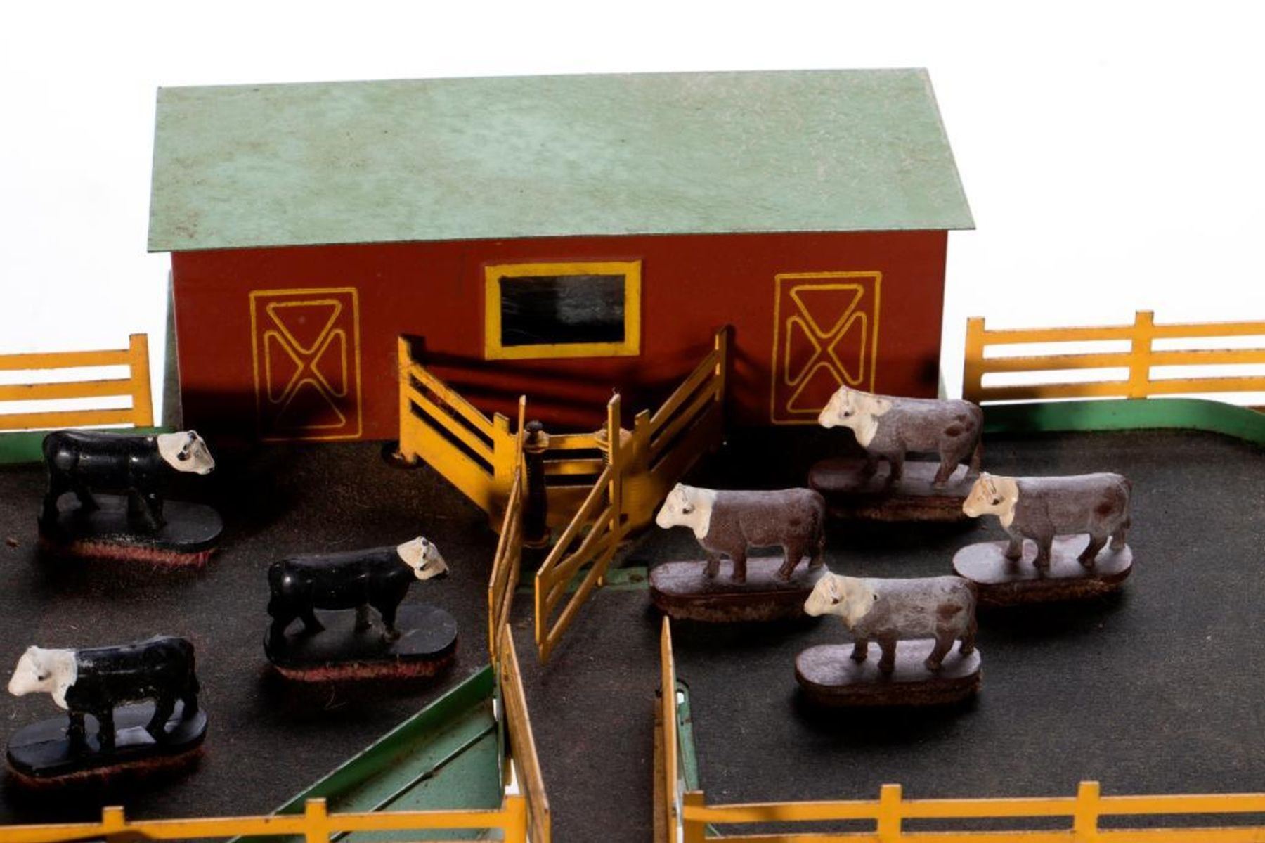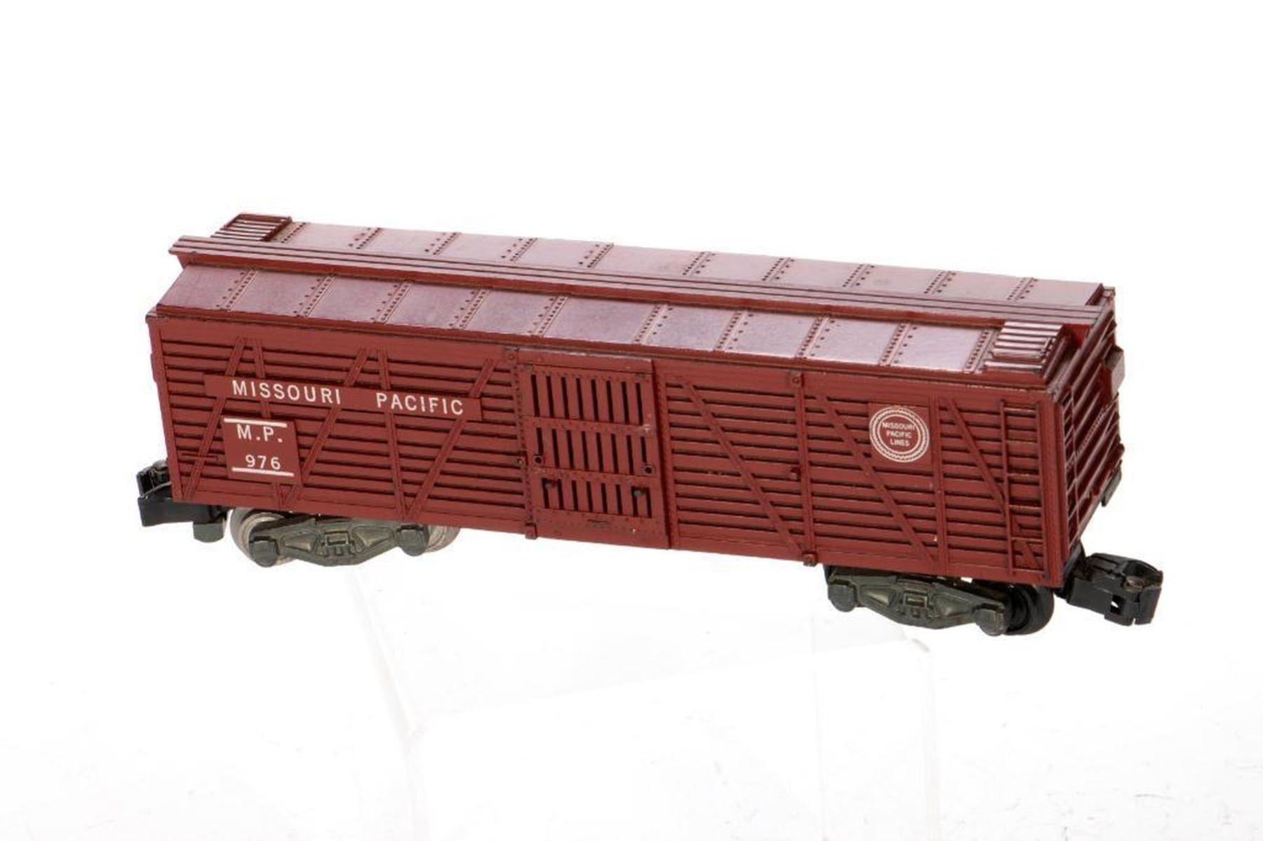 Stockyard shed has roof, all 8 cows present. Control button is present. 976 car has one bent coupler that is missing the coupler weight and is missing its brake wheel.