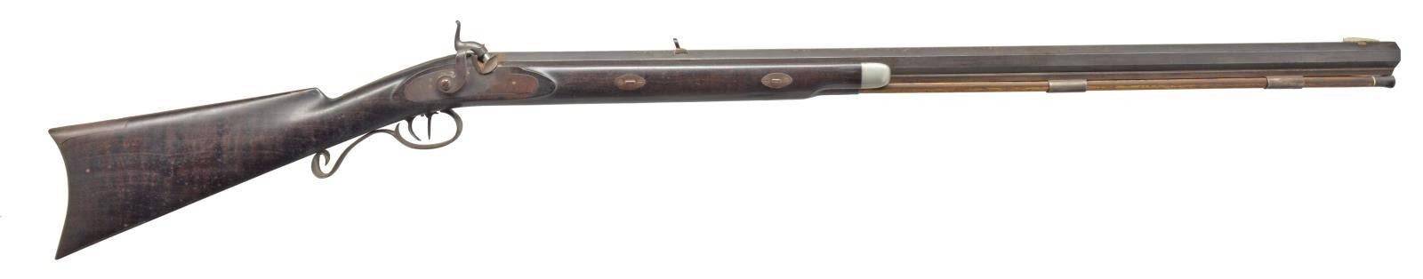 BREITENSTEIN. Cal. 58. NSN. Bbl. 34 1/2" heavy oct. bbl. fitted w/ buck horn rear & German silver blade front sights. Maker's name engraved on top flat. Daniel Breitenstein is known more for his contemporary long rifles. Consignor states that the rifle was made for him & that this is the only Hawken type rifle he ever made. Rifle features correctly styled lock & other iron furniture & is fitted w/ dbl. set triggers. Stock is of dark, nicely figured American walnut & features swept right hand cheekpiece & pewter forend tip. A hickory ramrod w/ horn tip is held by two plain pipes mounted on under rib & matching plain iron thimble. CONDITION: very fine, nicely aged giving classic appearance. Rifle appears to have been fired very little & has only a few minor handling marks. Bore is bright & shiny, but has some minor rusting toward muzzle. Mechanically fine. (01-18758/MGM). ANTIQUE. $2,000-3,000.