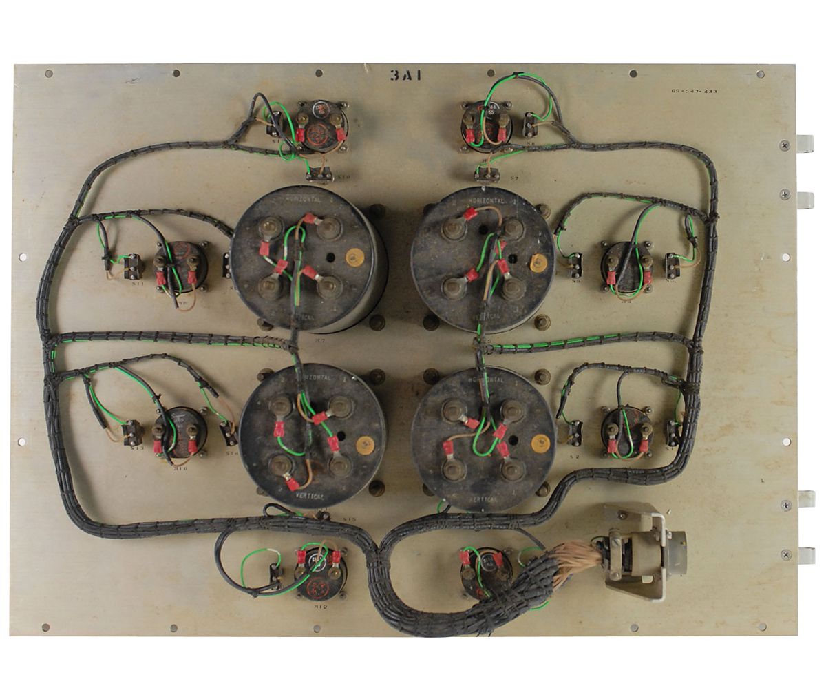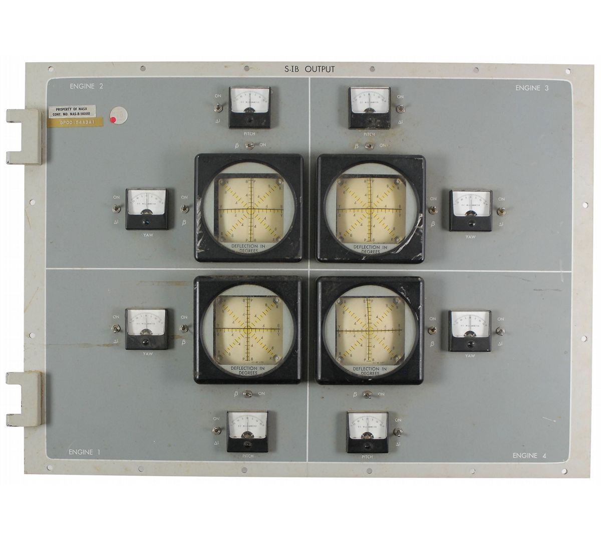 Very rare complete Apollo-era S-IB Output control panel used at either the Kennedy Space Center or Mission Control. Panel measures 24 x 17.5 x 5.5, with a “Property of NASA,” label affixed to top left, and a printed label underneath numbered “GP00154A3A1.” Board is divided into four equal sections for the four outboard H-1 engines on the Saturn IB first stage, each with an ‘X’ and ‘Y’ hydraulic actuator, as well as switches to control each engine’s pitch and yaw. This panel was used to indicate gimbaling (the change in angle of orientation) of all four engines on the Saturn first stage. Gimbaling was used to apply directional thrust to keep the rocket on its proper trajectory. The four cathode ray tubes (CRT) displayed the affiliated ‘X’ and ‘Y’ hydraulic actuator deflection for each of the engines to report their health and status to the ground controller. The Saturn IB launched two unmanned CSM suborbital flights, one unmanned LM orbital flight, and the first manned CSM orbital mission (first planned as Apollo 1, later flown as Apollo 7). It was used between 1973 and 1975 for three manned Skylab flights, and one Apollo-Soyuz Test Project flight.
