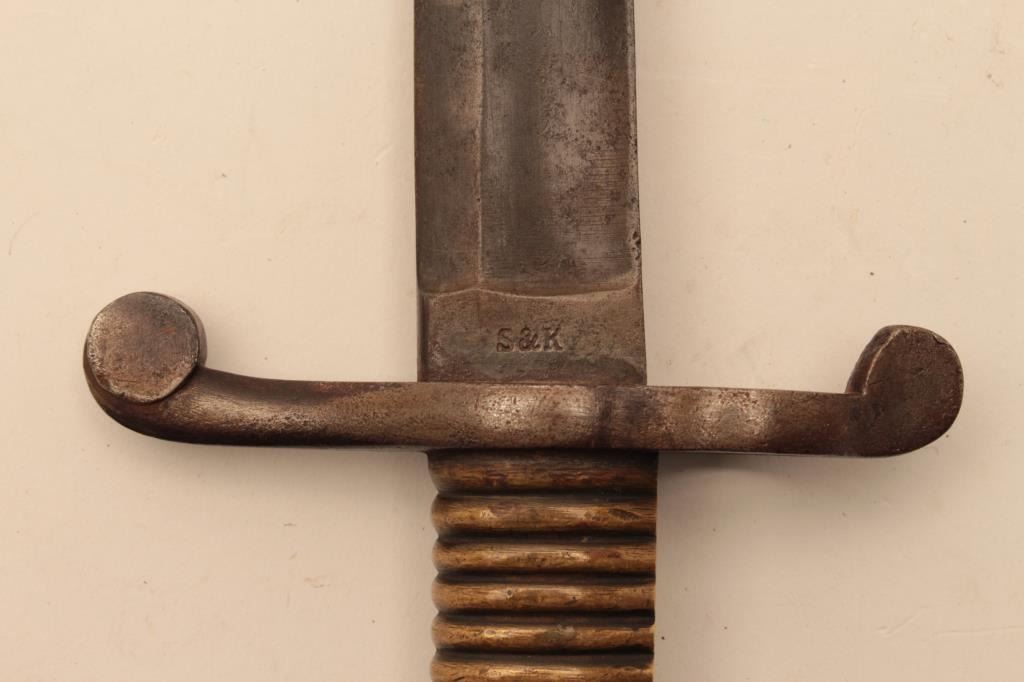 S+K Solingen marked Sabre Bayonet 24” Blade, 28” overall mid 19th century possibly Colt, Fair to good condition. Some pitting in revolving rifle. Est:$150-300