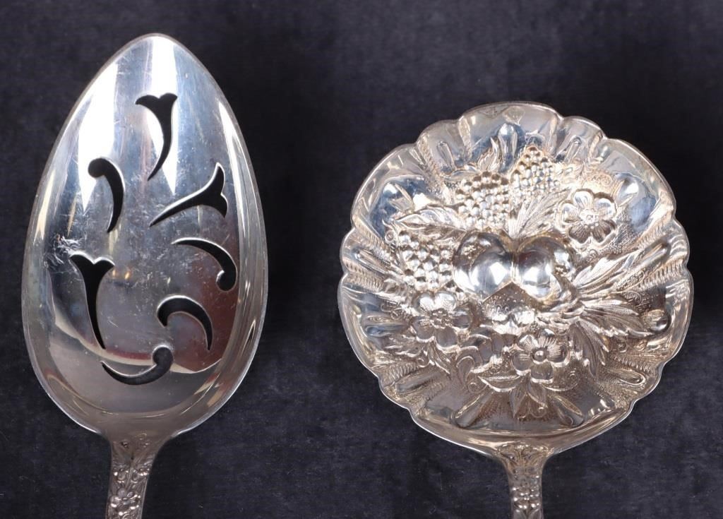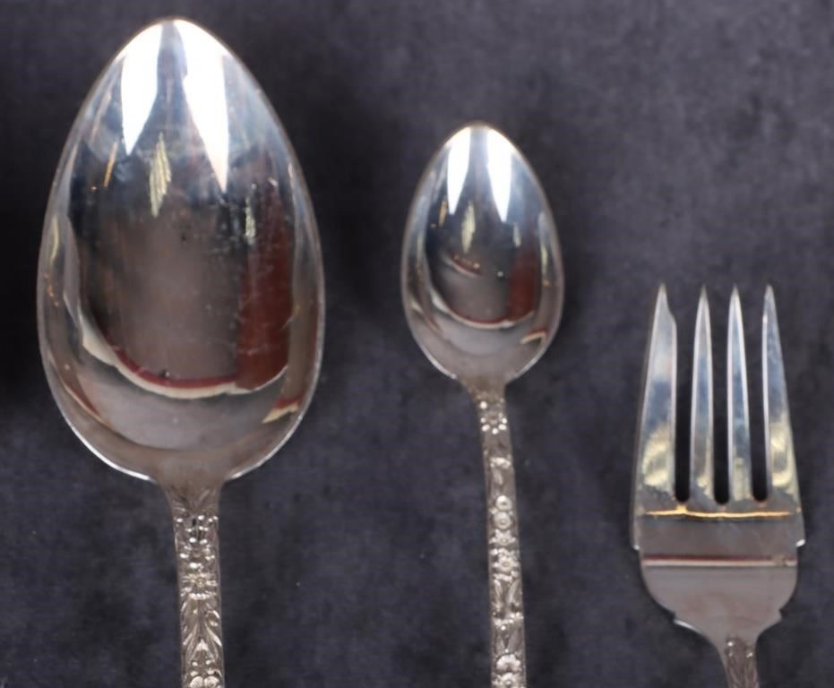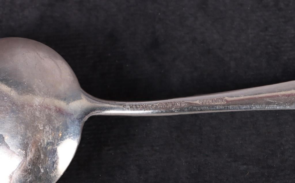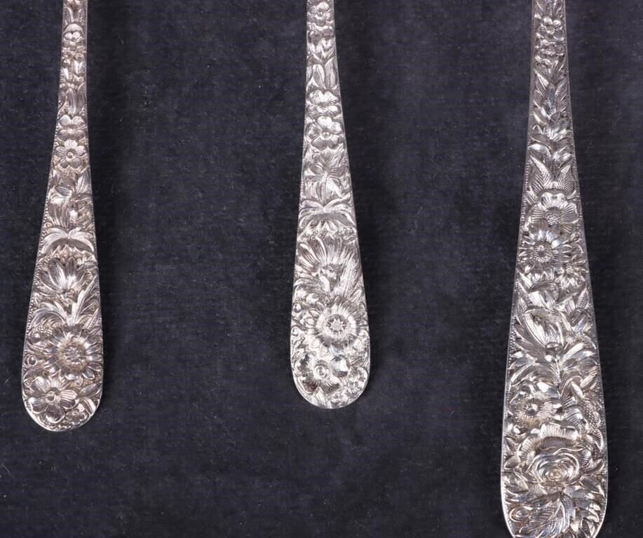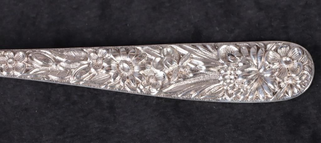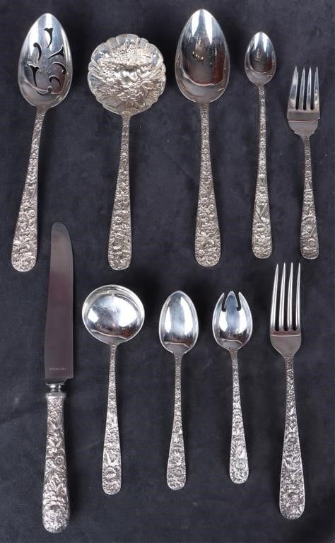S. Kirk & Son Sterling Silver repousse silverware to include one butter knife, one spork, two forks, two spoons, one soup spoon, two serving spoons, and one ornamental beautiful serving spoon.