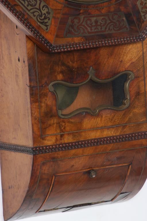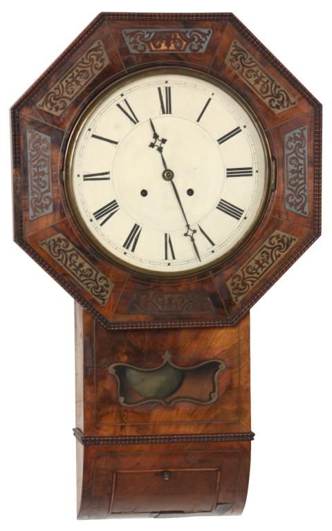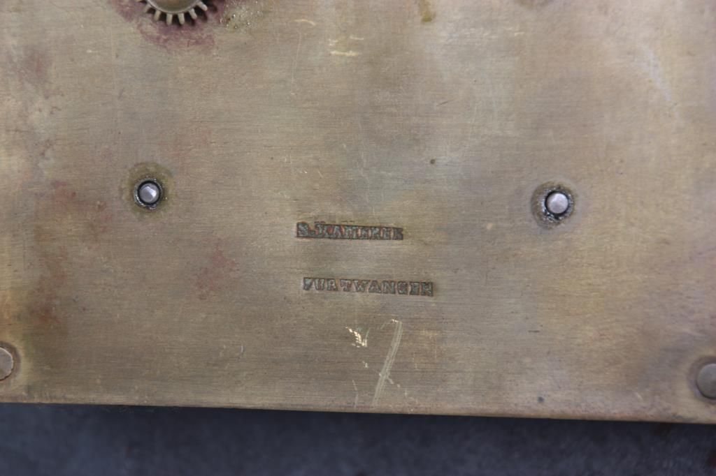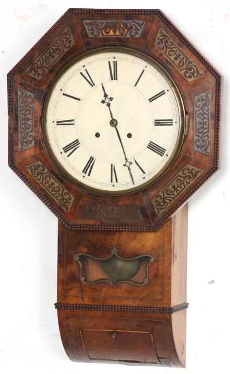 S. Kamerer, Furtwangen Drop Octagon Regulator. 10 in. repainted metal dial has black hour numerals, pierced black hands with brass door bezel; brass 8 day spring driven movement signed “S. Kamerer, Furtwangen”, has a recoil escapement and countweel hour drop hammer strike on a coiled gong at the top of the case. Case has an octagonal top with alternating brass and pewter inlaid pierced filigree and piecrust outer edge; short drop section has lower door glass exposing the brass pendulum and a curved front bottom. Refinished, case is missing filigree side decorations below the dial and missing a few inlays. 28 in. high x 16.5 in. wide x 6 in. deep.