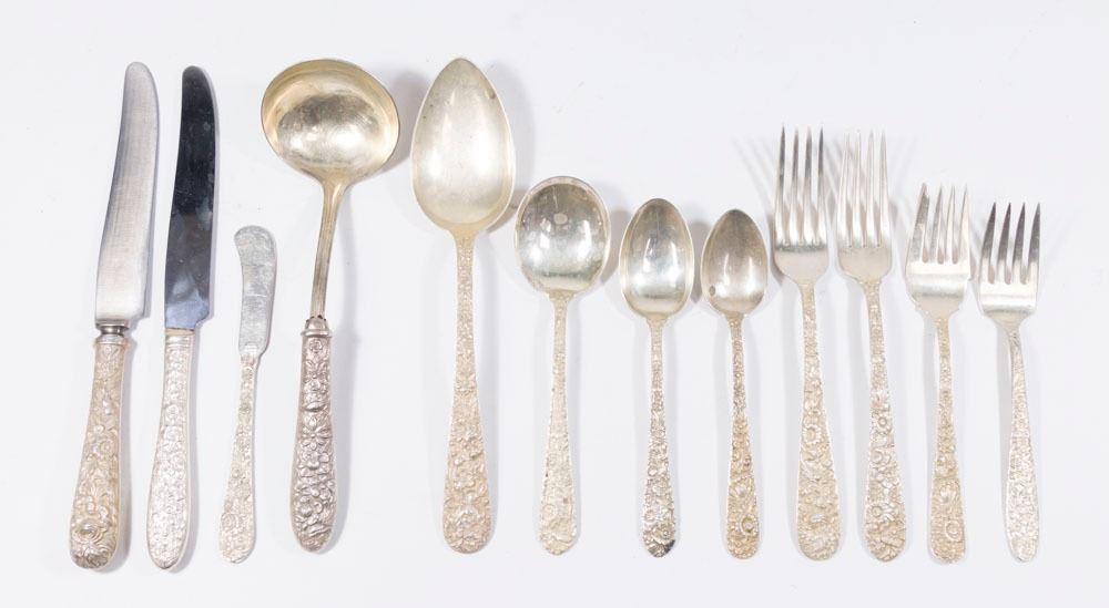 Including 6-7 1/8" forks, 6-9" knives, 6 bouillon soups, 6 salad forks, 6 butter pats, 9 teaspoons, serving spoon, and ladle. Weighable approx. 40 ozt. 41 pieces total. (6019)