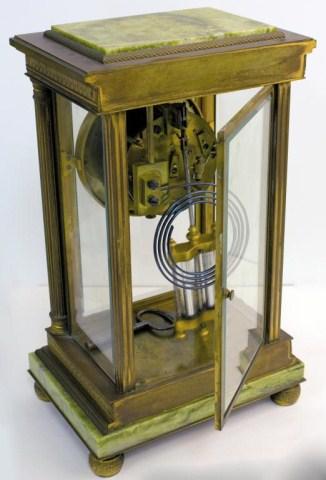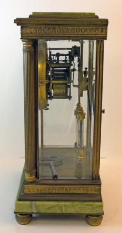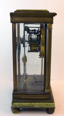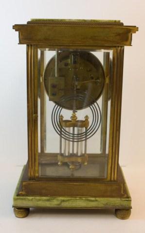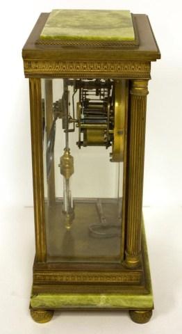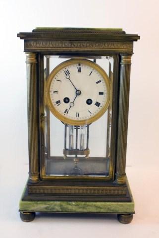 Has white enamel face with black roman numerals and notches. Has black hour and minute hands. Clock has a columnar design. Tiered with a different pattern on each tier. Has slabs of green marble on the bottom and top. Clock is footed and has a on interesting floral pattern on the feet. We have the key and original mercury pendulum. Movement is marked 6783 52. Made by S. Marti et Cie. Dated 1889. Measures 12 3/4" height x 7 3/8" width x 5 5/8" depth.