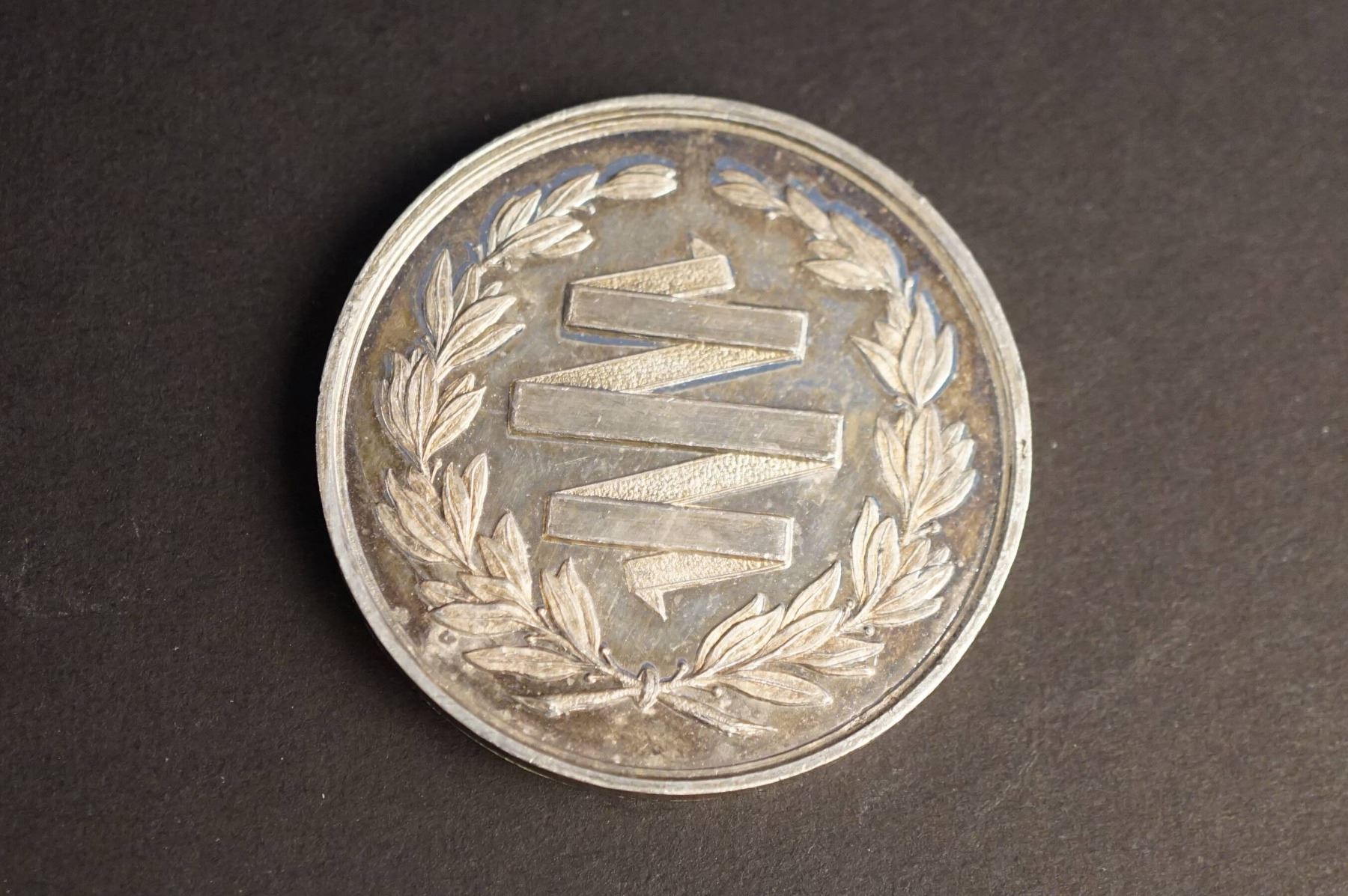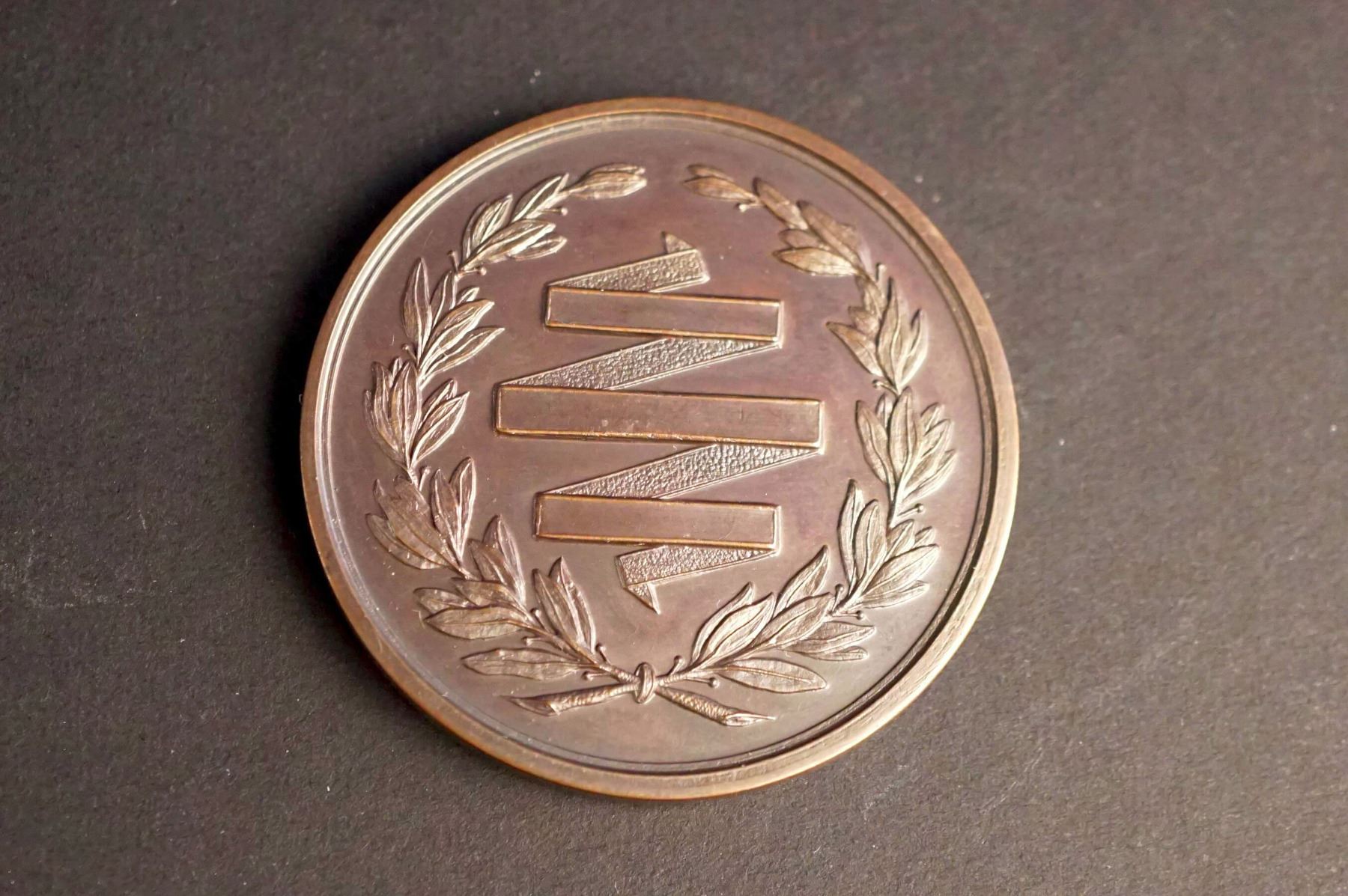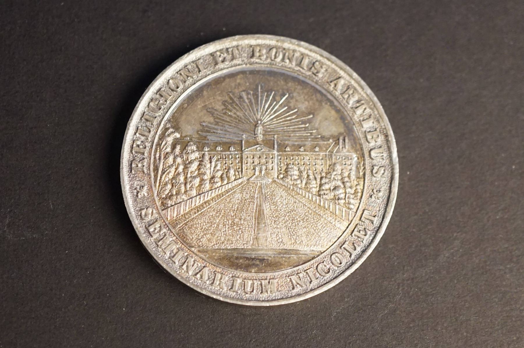 RELICIONIS ET BONIS ARTIBUS above, SEMINARIUM NICOLET below. At center: a design of the Seminary with rays from the top. Reverse: A flat winding ribbon, surrounded by a wreath. Common diameter is 44 mm. One is bronze and weighs 44.0 grams. The other is silver or silver plated and weighs 36.3 grams. Both are Choice UNC.