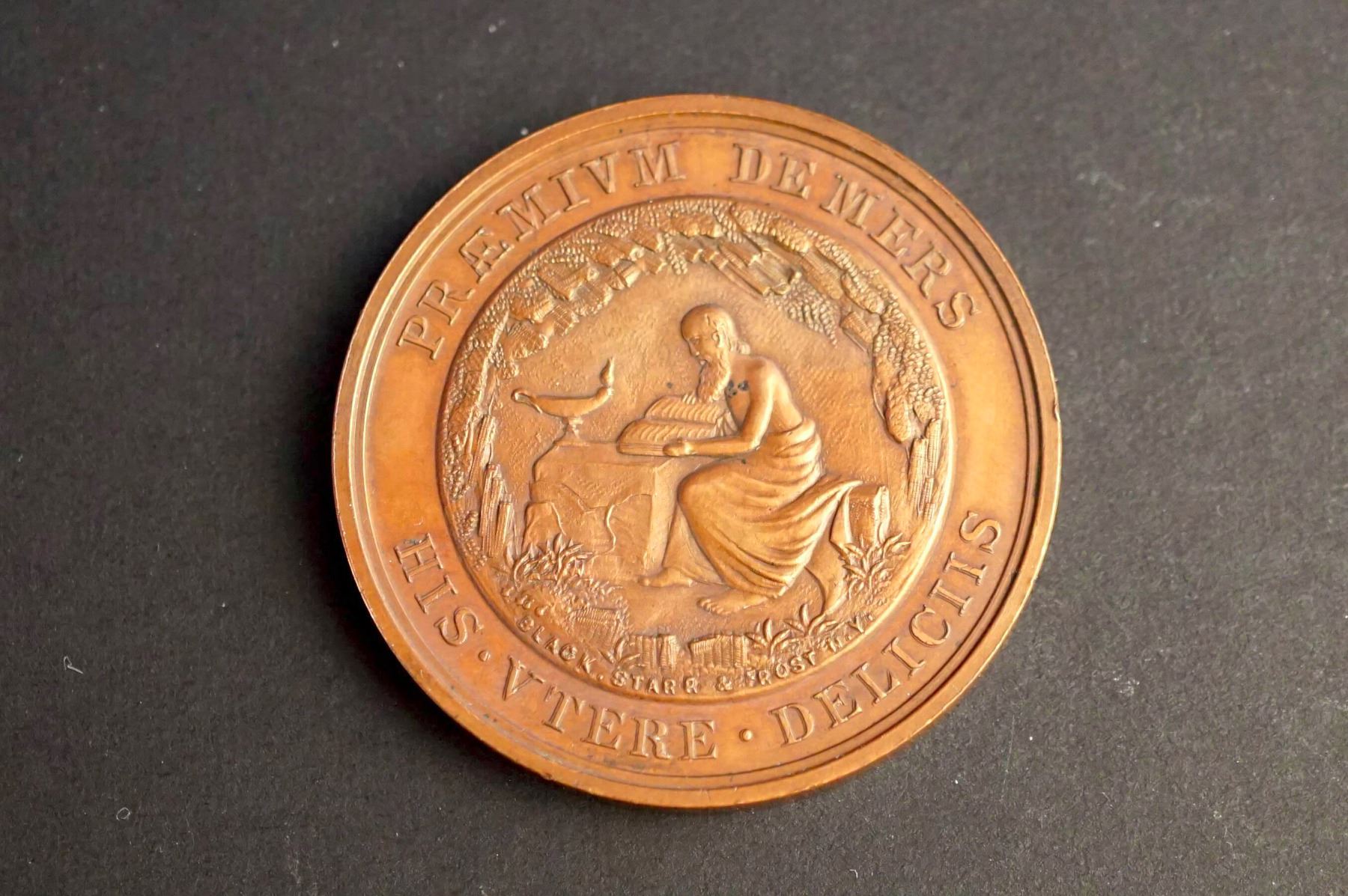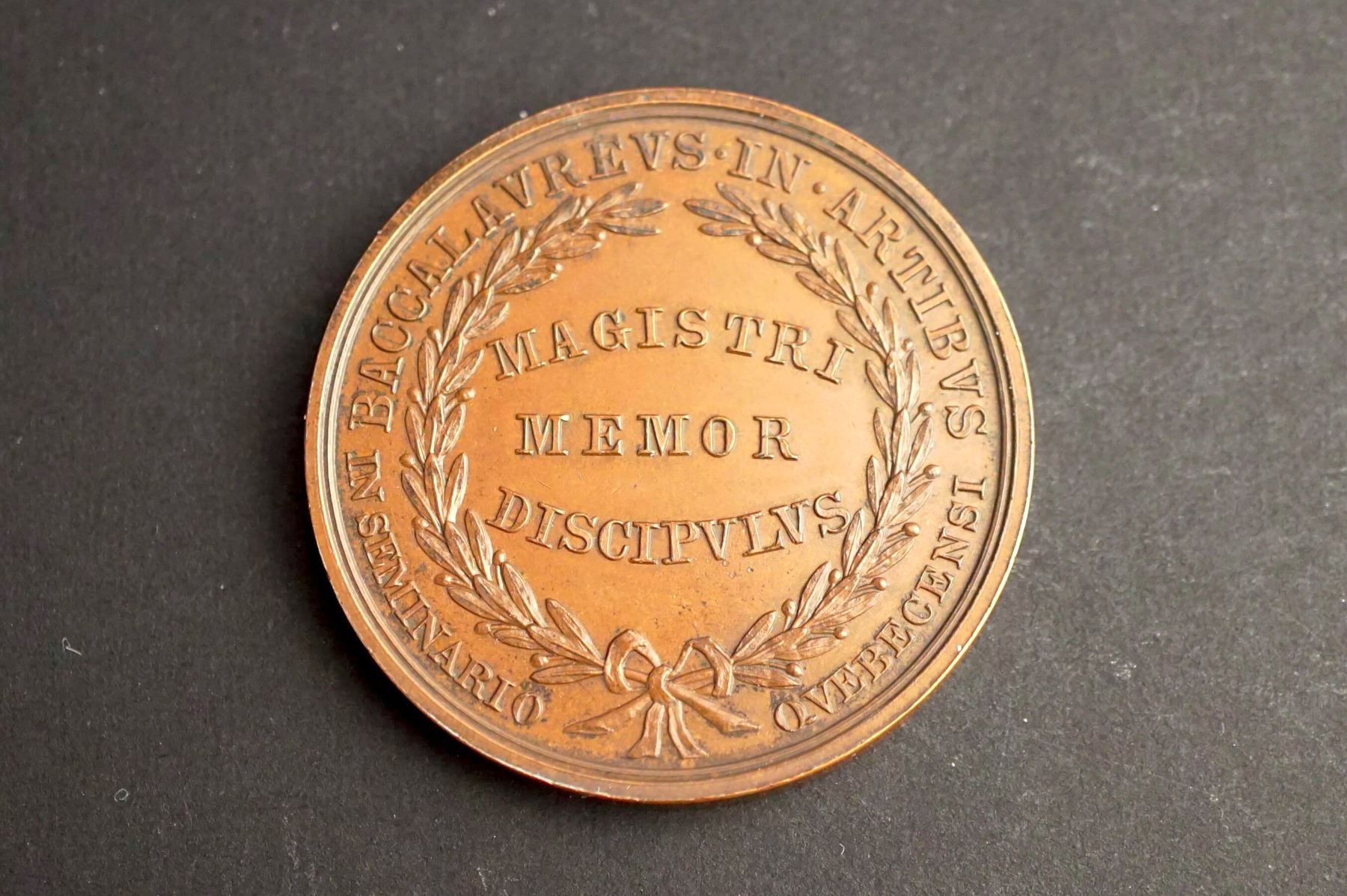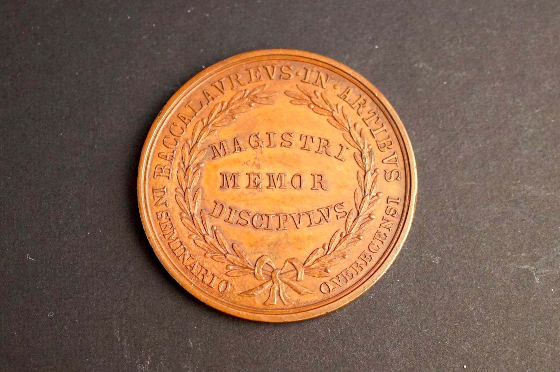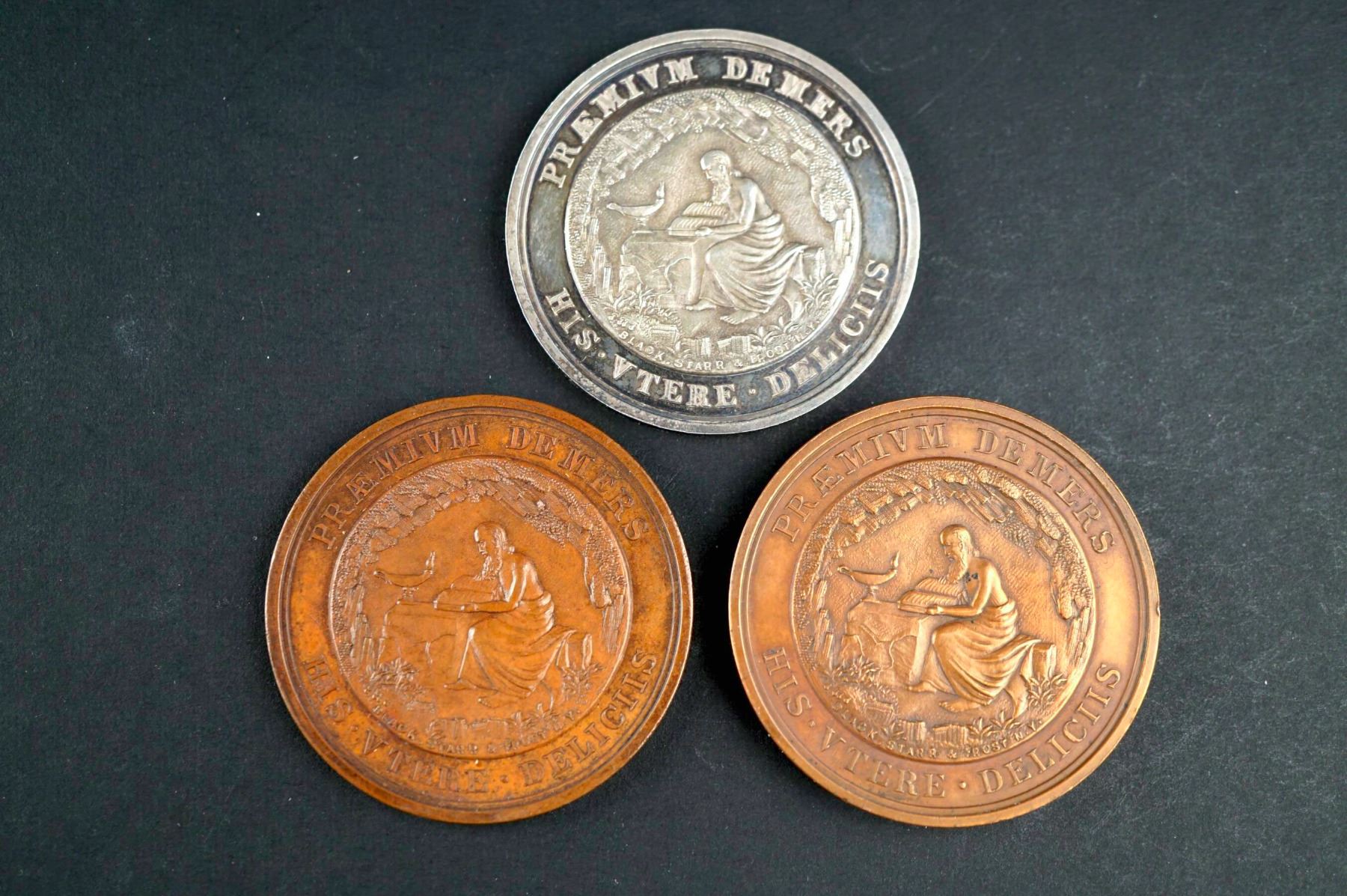 Three medals, same dies. One is silver or silver plated and weighs 26.5 grams. Two are in copper, one on a thin planchet and weighing 32.9 grams. The other is on a thick planchet & weighing 54.4 grams. The common diameter is 44 mm. The obverses read on top: PRAEMIUM DEMERS. Below: HIS. UTERE. DELICIIS. The central design is of an elderly man with a long beard, seated at a table, reading a book, and wearing an ancient style robe. On the table, an oil lamp. Signed at bottom of the design: BLACK, SRARR, AND FROST N.Y. Reverse: BACCALAVREVS. IN. ARTIVS. around wreath. Inside: MAGISTERI / MEMOR / DISICVPVLVS. At bottom: in smaller IN SEMINARIO QVEBECENSI. General condition is AU.