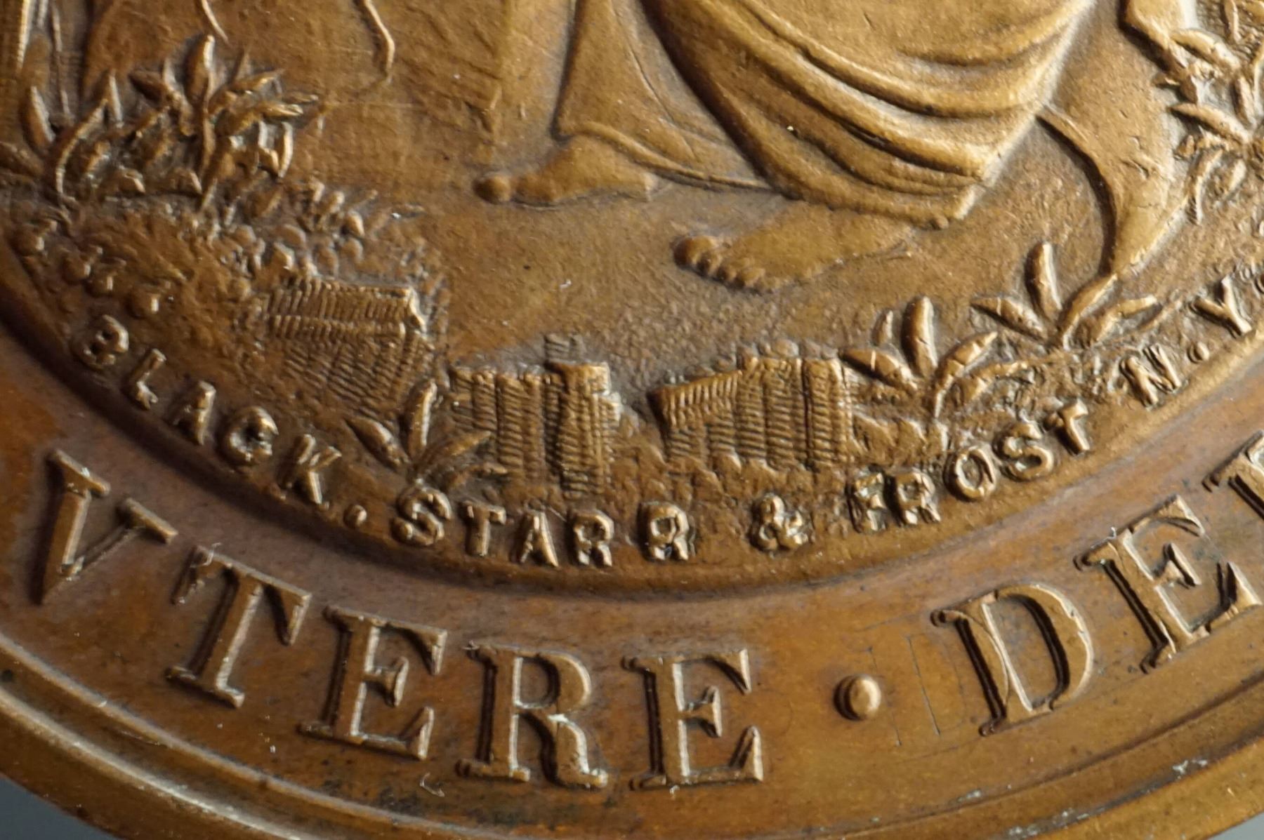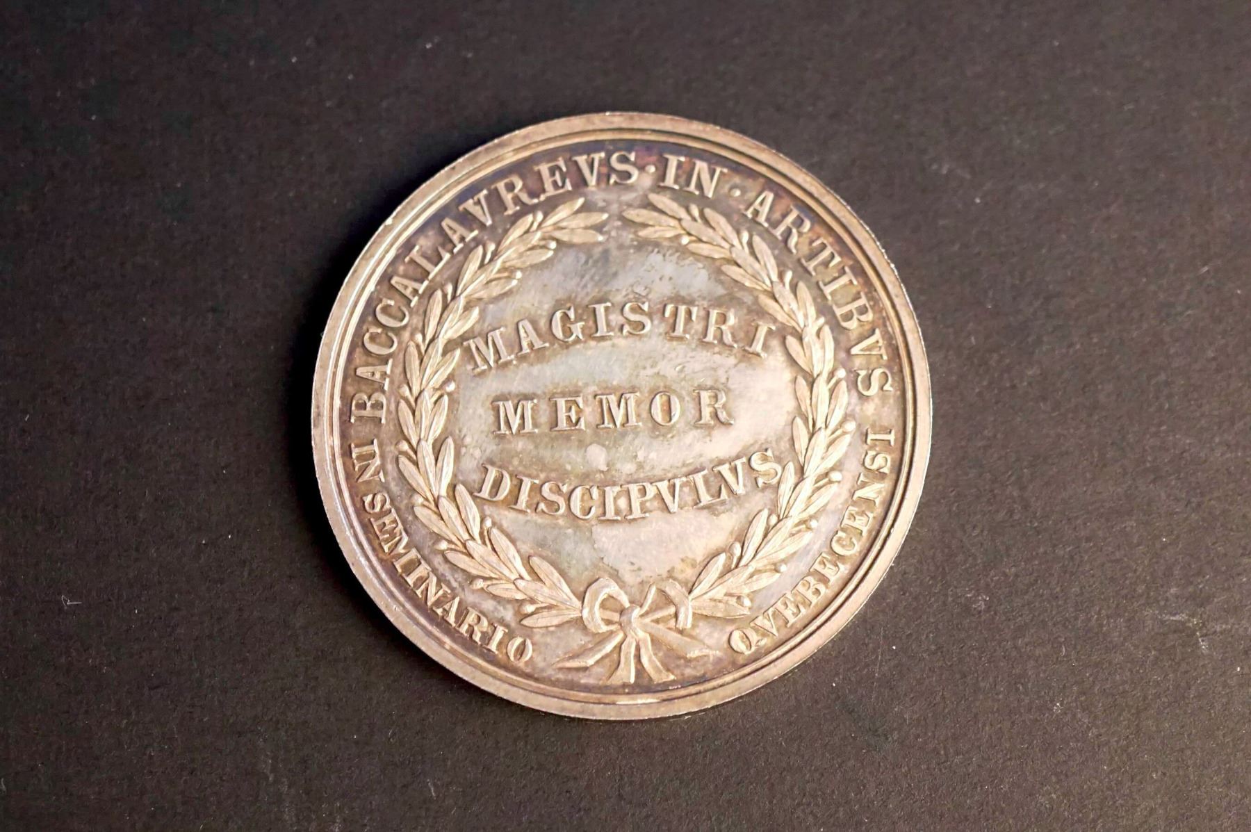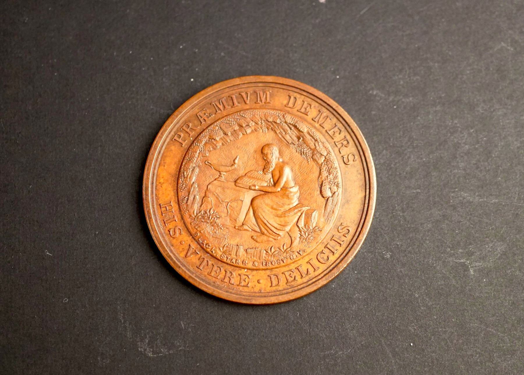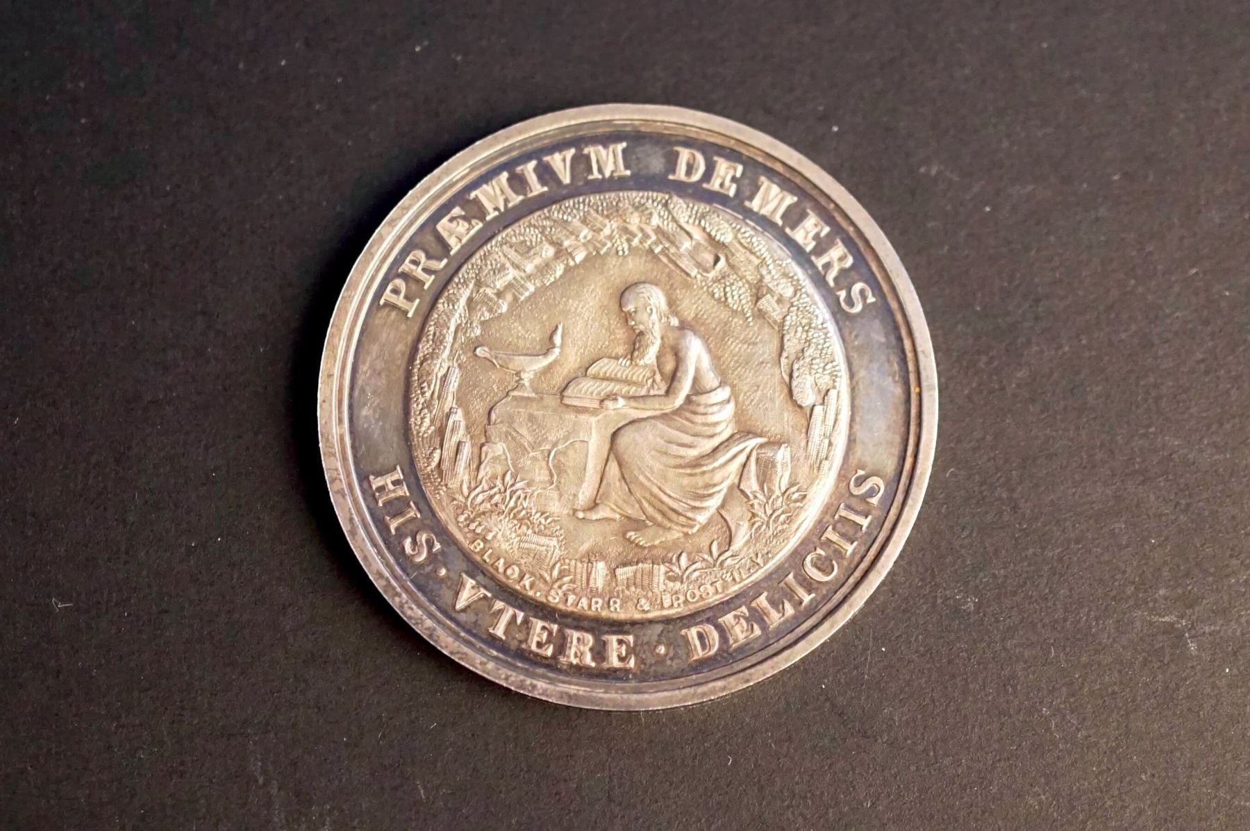 Three medals, same dies. One is silver or silver plated and weighs 26.5 grams. Two are in copper, one on a thin planchet and weighing 32.9 grams. The other is on a thick planchet & weighing 54.4 grams. The common diameter is 44 mm. The obverses read on top: PRAEMIUM DEMERS. Below: HIS. UTERE. DELICIIS. The central design is of an elderly man with a long beard, seated at a table, reading a book, and wearing an ancient style robe. On the table, an oil lamp. Signed at bottom of the design: BLACK, SRARR, AND FROST N.Y. Reverse: BACCALAVREVS. IN. ARTIVS. around wreath. Inside: MAGISTERI / MEMOR / DISICVPVLVS. At bottom: in smaller IN SEMINARIO QVEBECENSI. General condition is AU.
